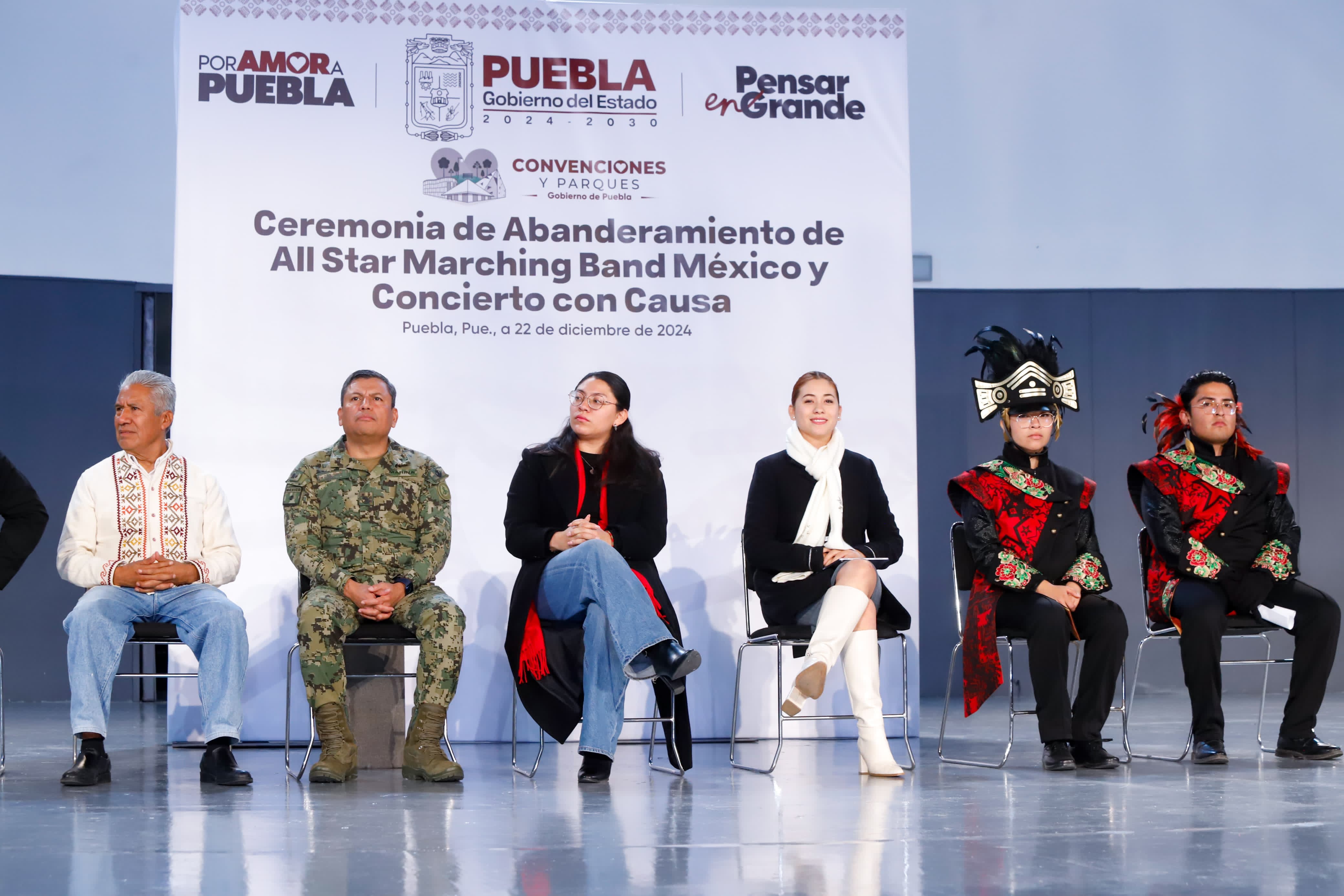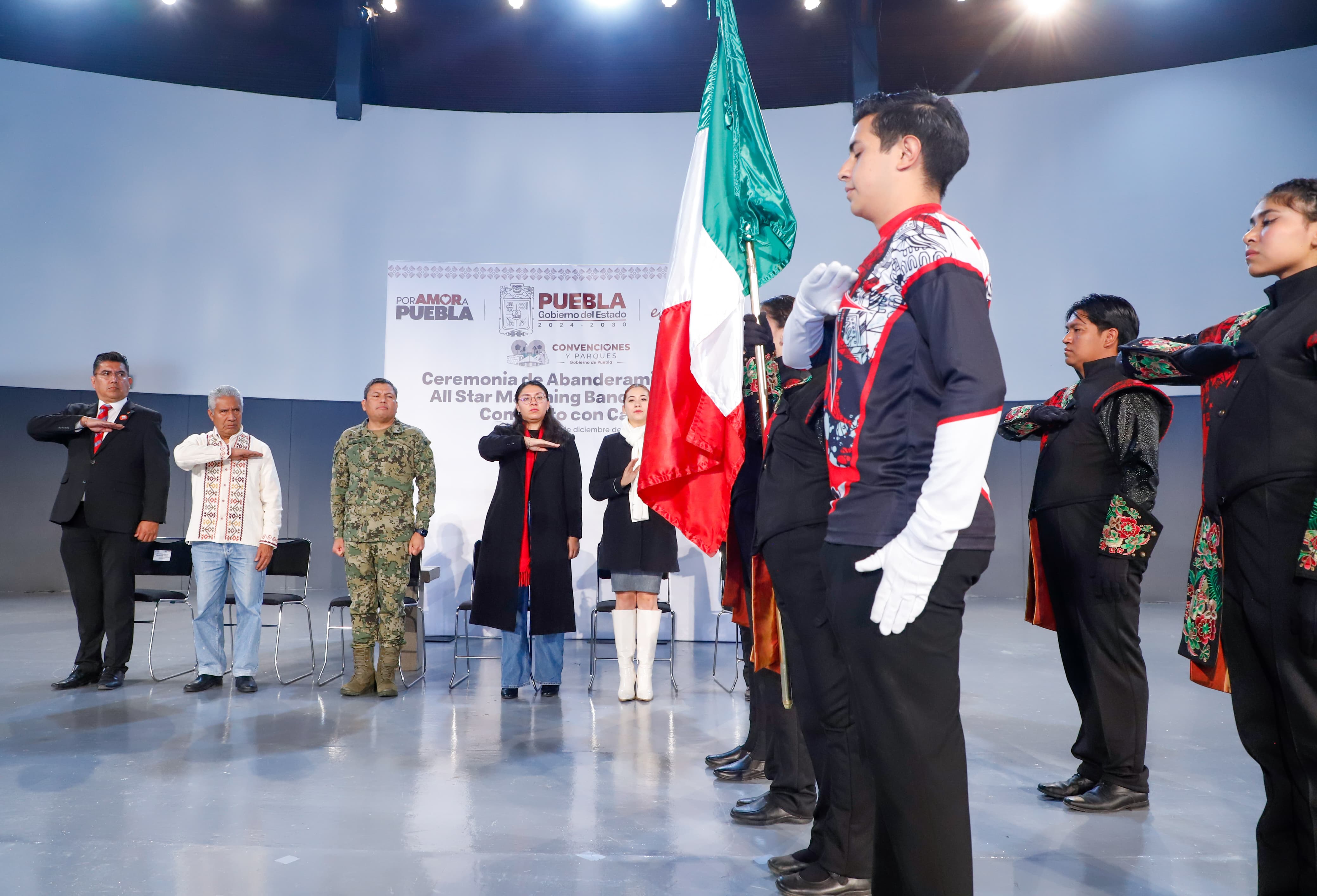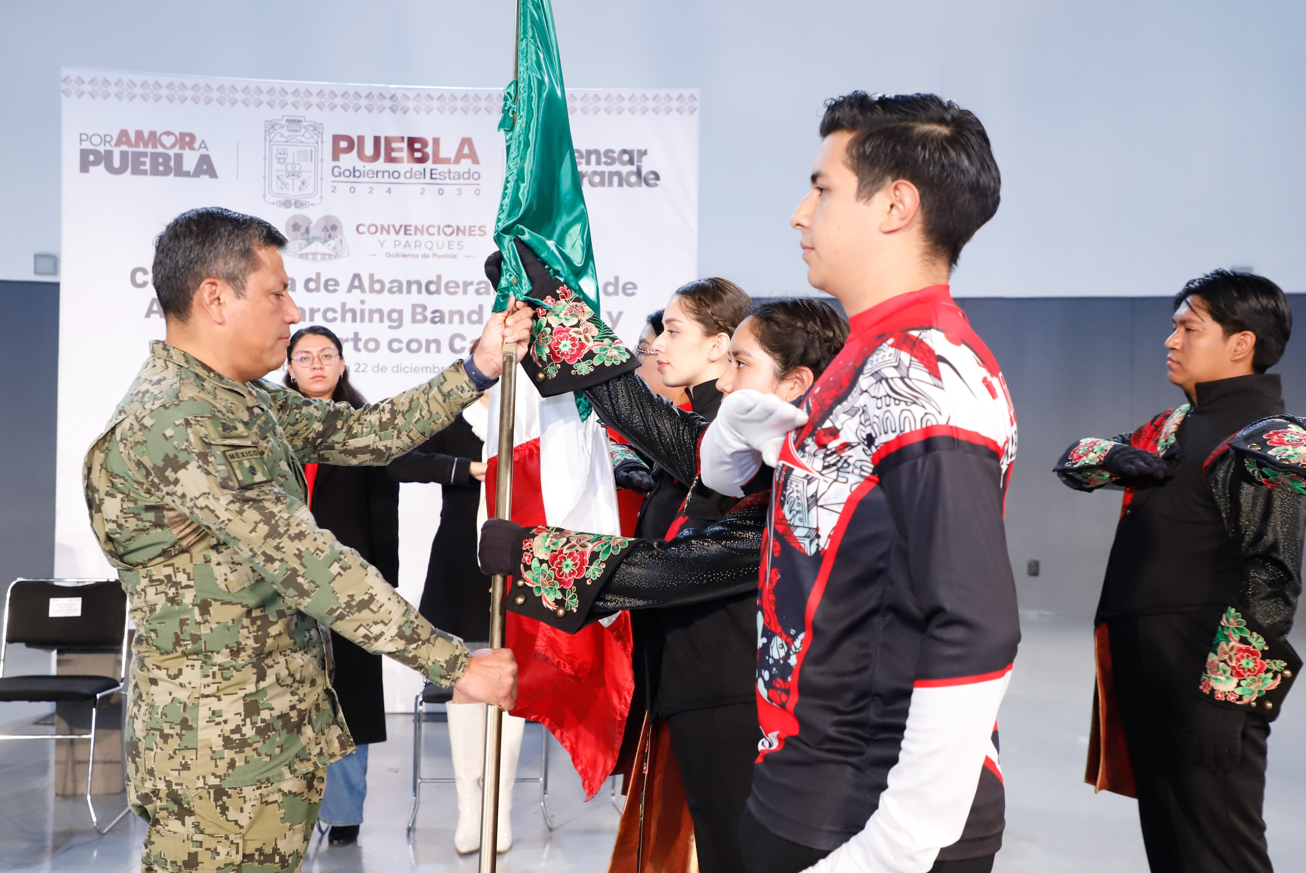 PUEBLA, Pue.- En un ambiente lleno de ánimo y emotividad que se vivió en el Auditorio de la Reforma, el secretario de Seguridad Pública, vicealmirante Francisco Sánchez González, abanderó a las y los jóvenes que integran la “All Star Marching Band”, que el próximo 1 de enero de 2025, representará a Puebla en el tradicional Desfile de las Rosas en Pasadena, California, en el vecino país de Estados Unidos.