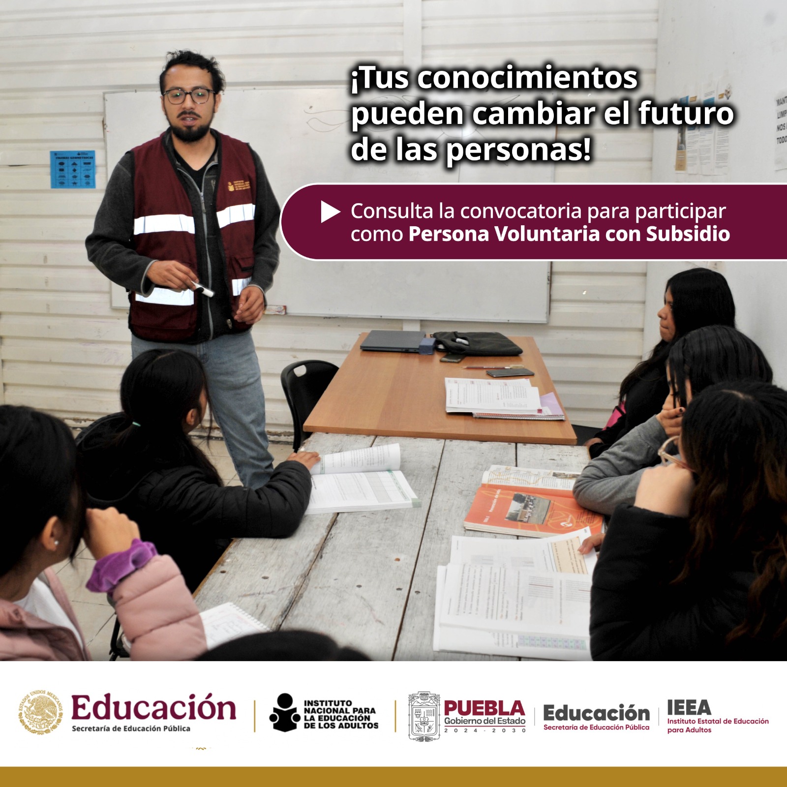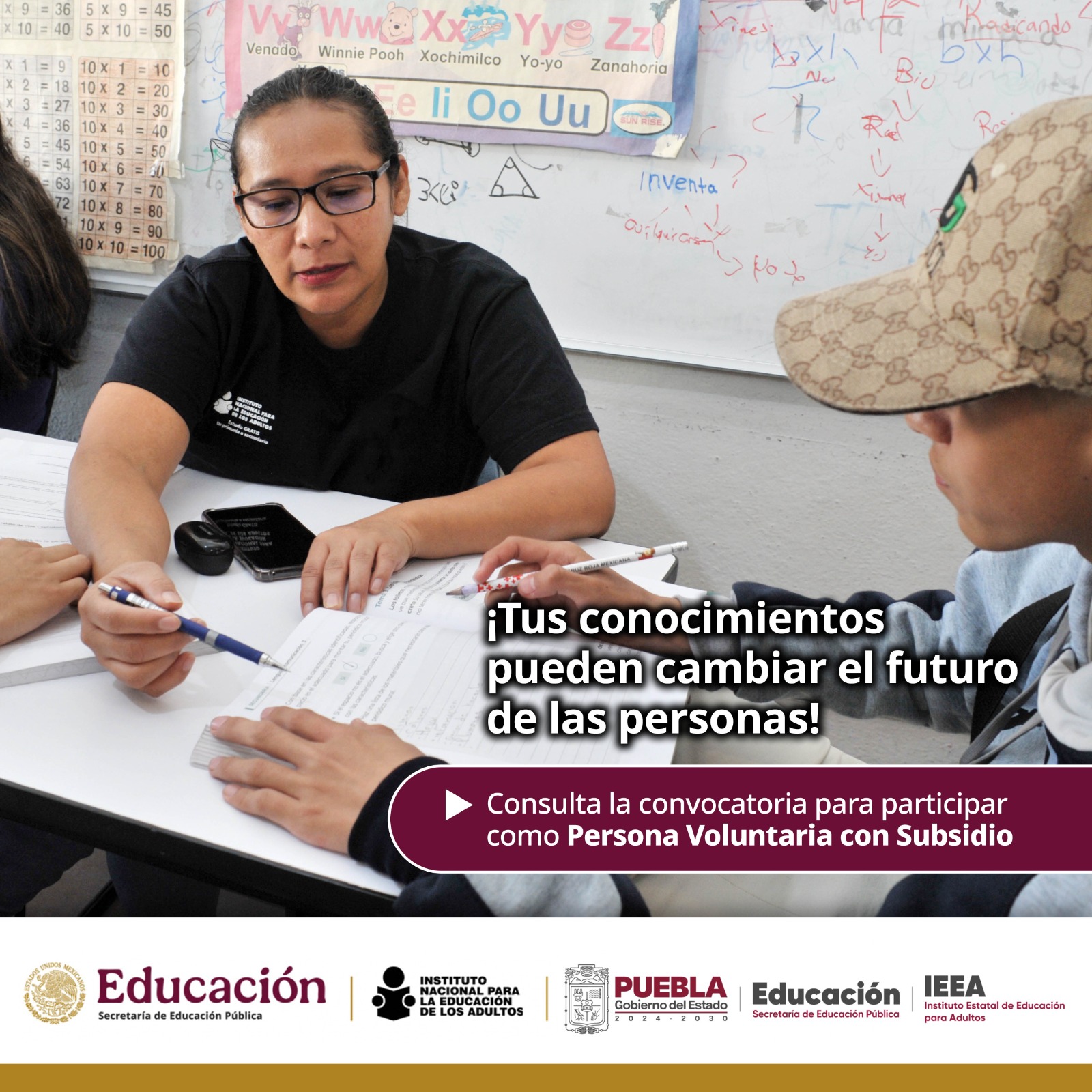 CIUDAD DE PUEBLA, Pue.- Este 3 de enero inicia la convocatoria para participar como Persona Voluntaria Beneficiaria del Subsidio, con el objetivo de apoyar en el Programa de Educación para Adultos, el cual ofrece alfabetización primaria y secundaria a jóvenes y adultos de 15 años o más, en situación de rezago educativo.