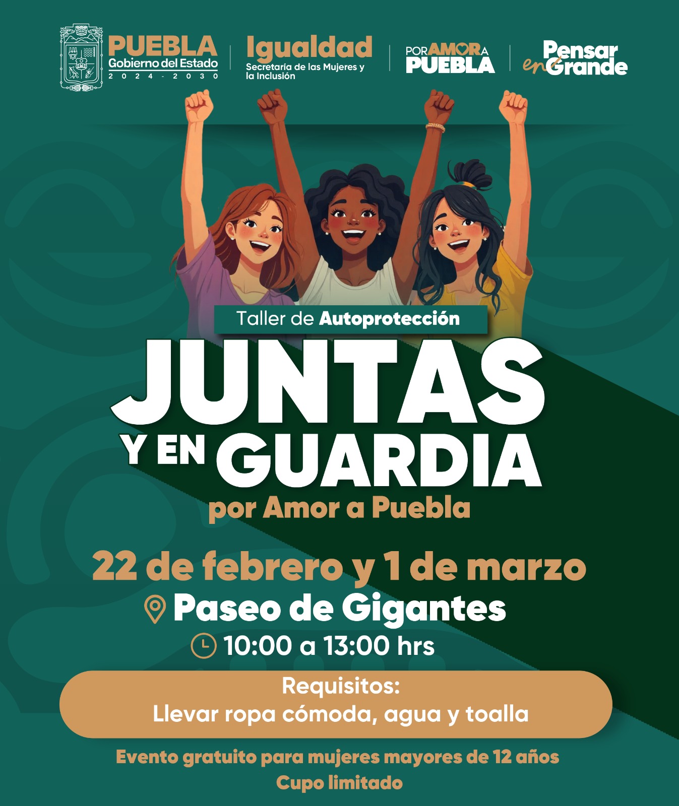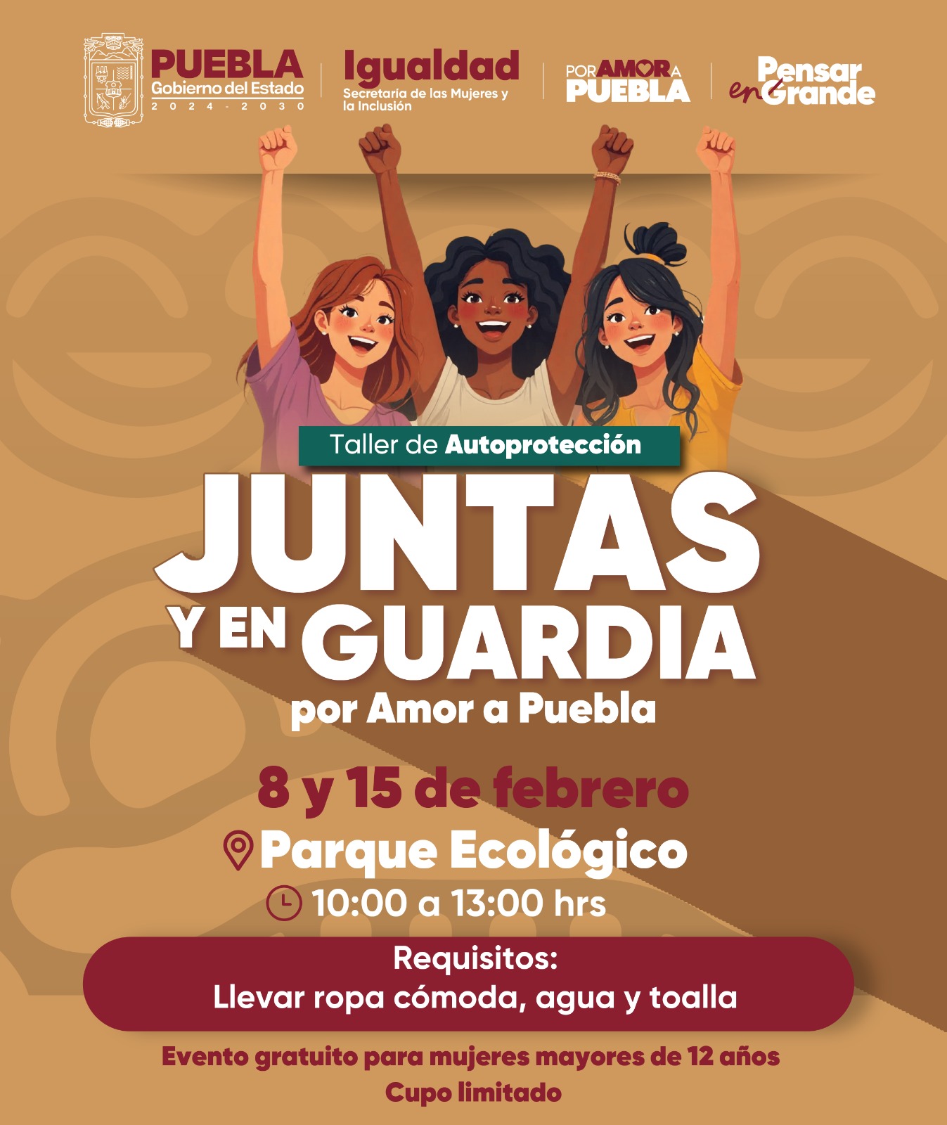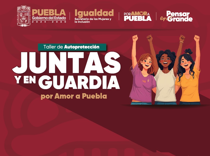 CIUDAD DE PUEBLA, Pue. – Con el objetivo de promover técnicas de autoprotección para las mujeres poblanas en un espacio seguro, el Gobierno del Estado de Puebla, encabezado por el mandatario Alejandro Armenta, a través de la Secretaría de la Mujer e Igualdad Sustantiva, llevará a cabo el taller gratuito y dirigido a mayores de 12 años, denominado “Juntas y en Guardia, Por Amor a Puebla”.