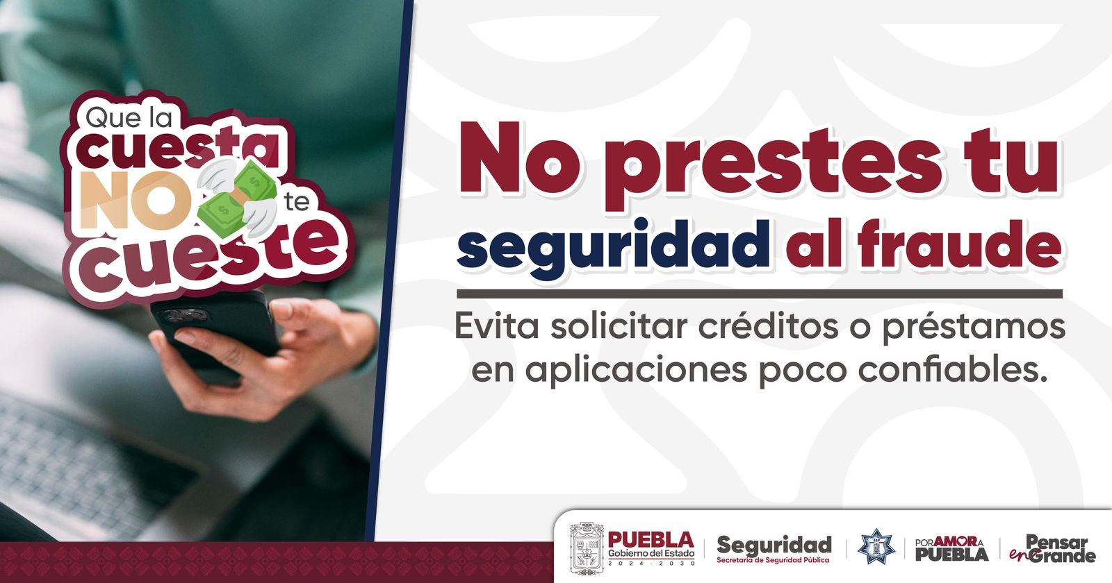CIUDAD DE PUEBLA, Pue.- El Gobierno del Estado de Puebla, que encabeza el mandatario Alejandro Armenta, a través de la Secretaría de Seguridad Pública (SSP), hace un llamado a la ciudadanía para redoblar las medidas de autocuidado ante el uso de aplicaciones de préstamo de dinero.