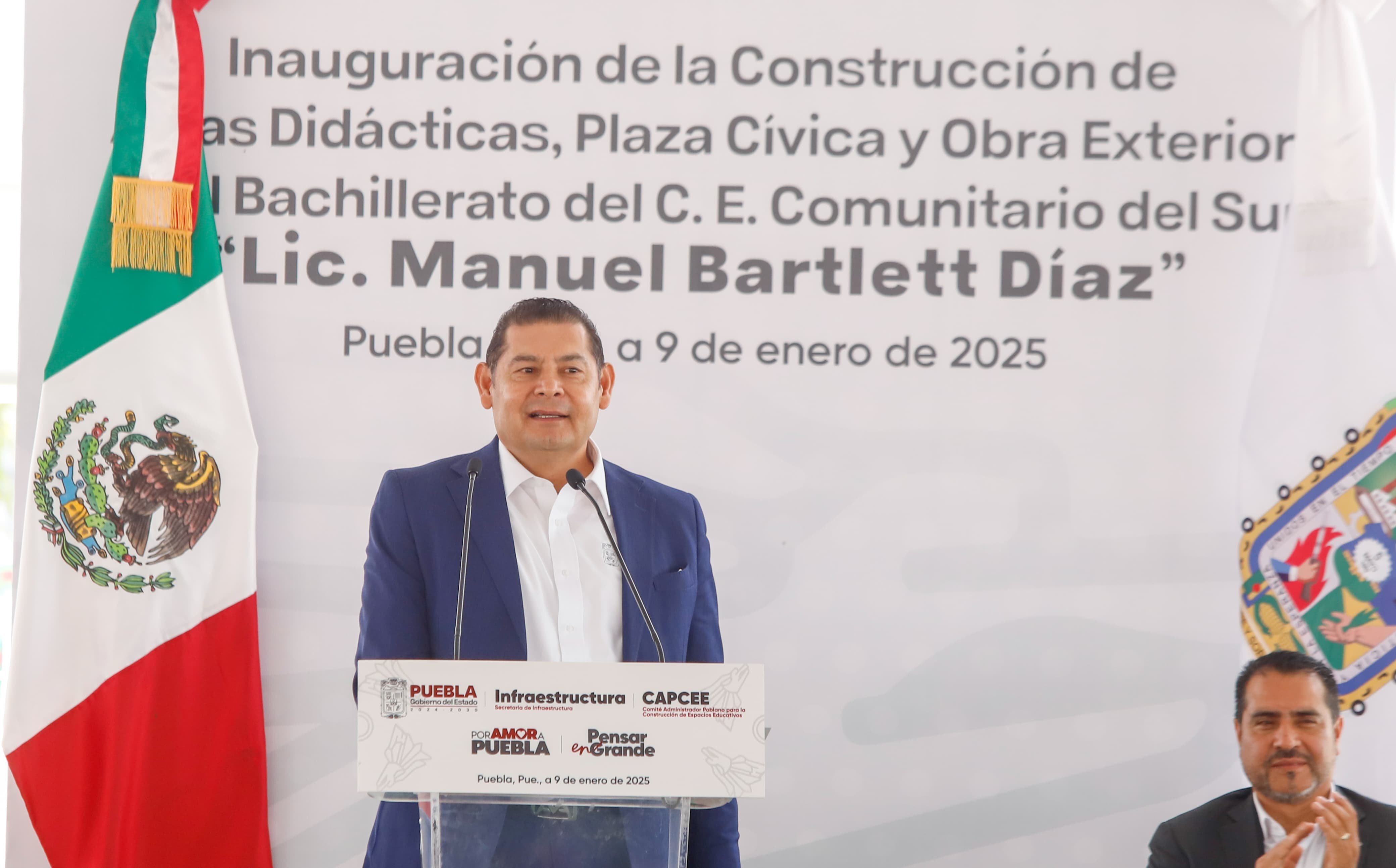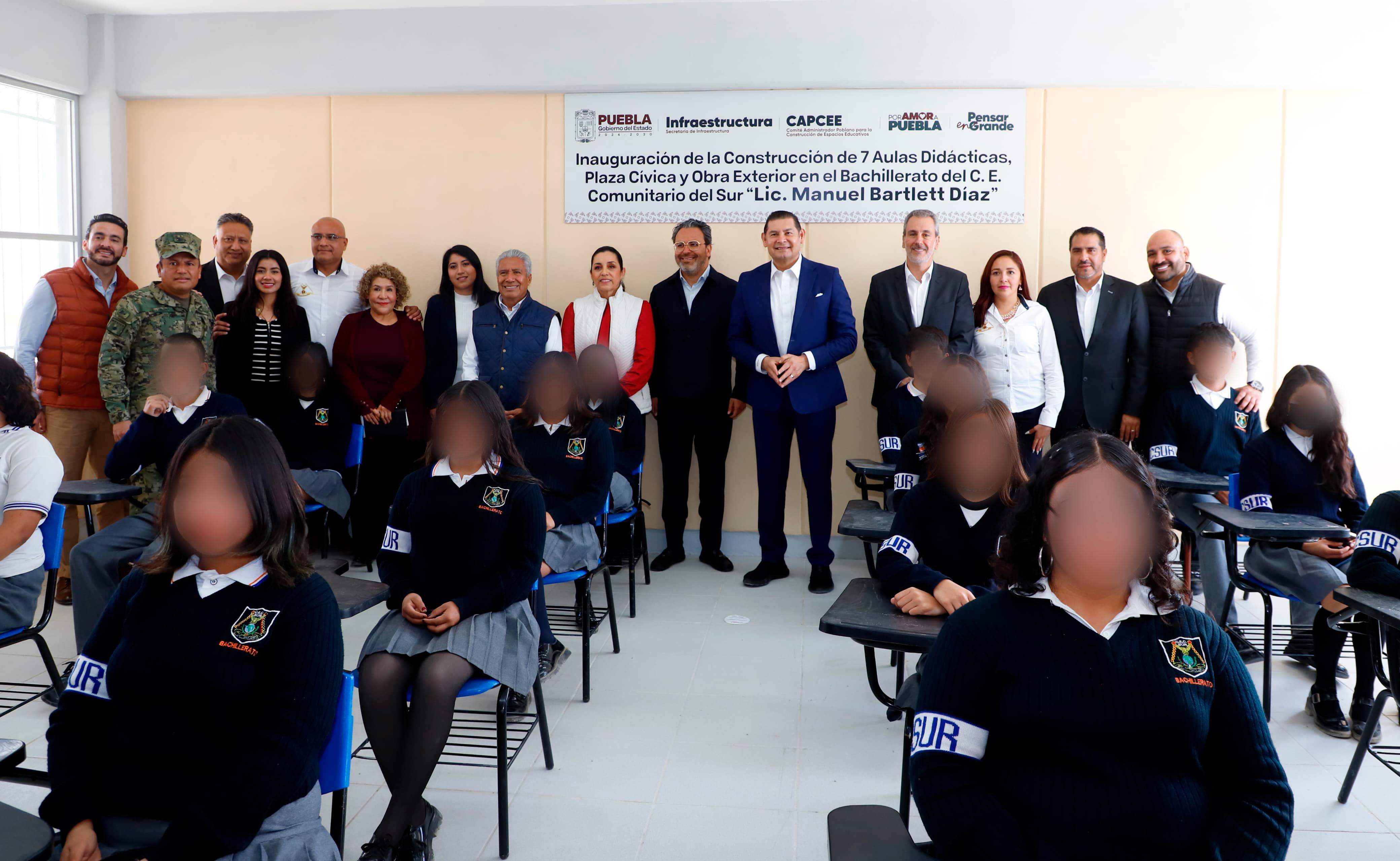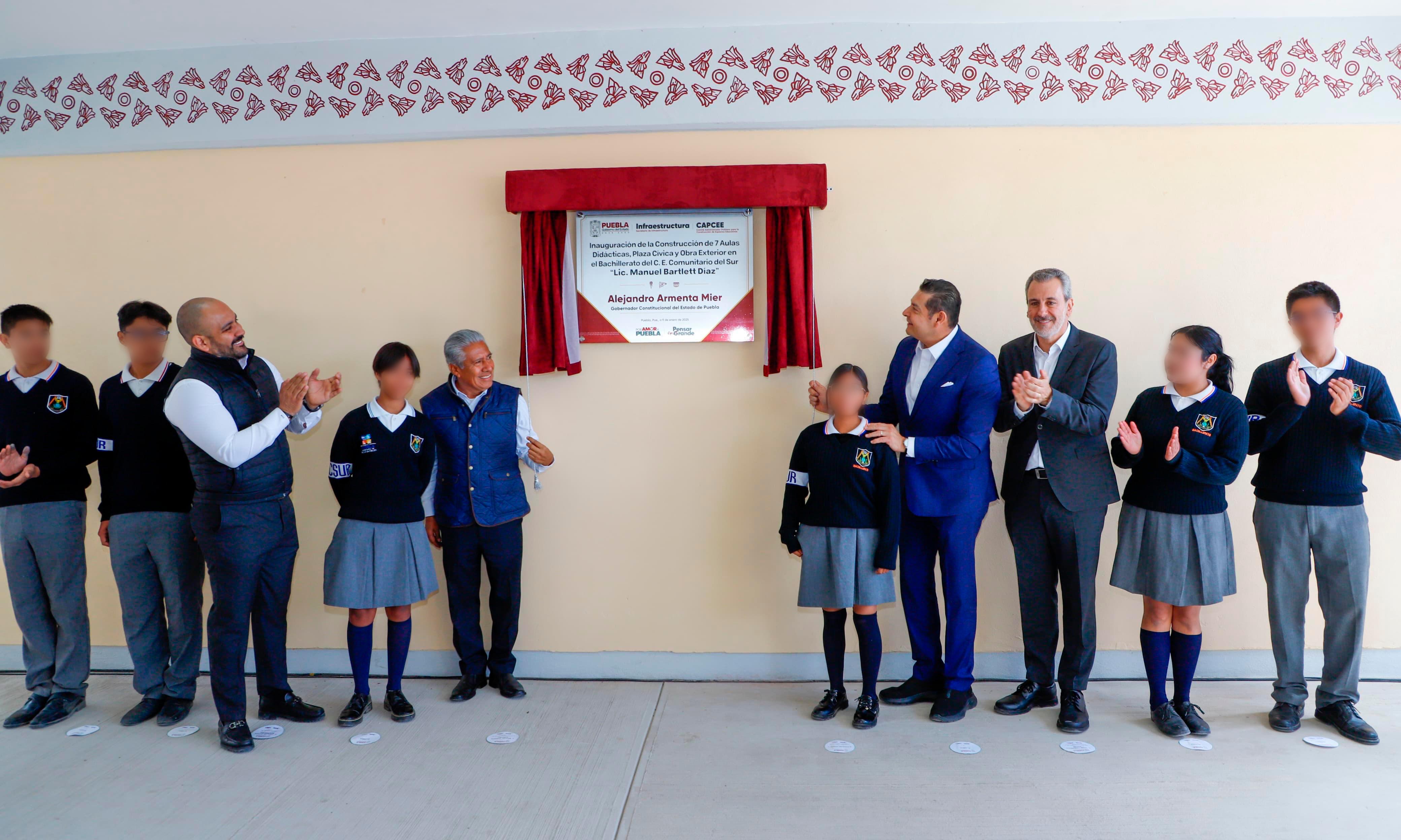 CIUDAD DE PUEBLA, Pue.- Con una inversión de 20 millones 51 mil 859 pesos, el Gobernador de Puebla, Alejandro Armenta, inauguró la construcción del edificio "A" del Bachillerato del Centro Escolar “Lic. Manuel Bartlett Díaz”, la cual consiste en el funcionamiento de siete aulas didácticas, módulo sanitario, dirección y laboratorio polifuncional en estructura, edificación de la plaza cívica y obra exterior.
