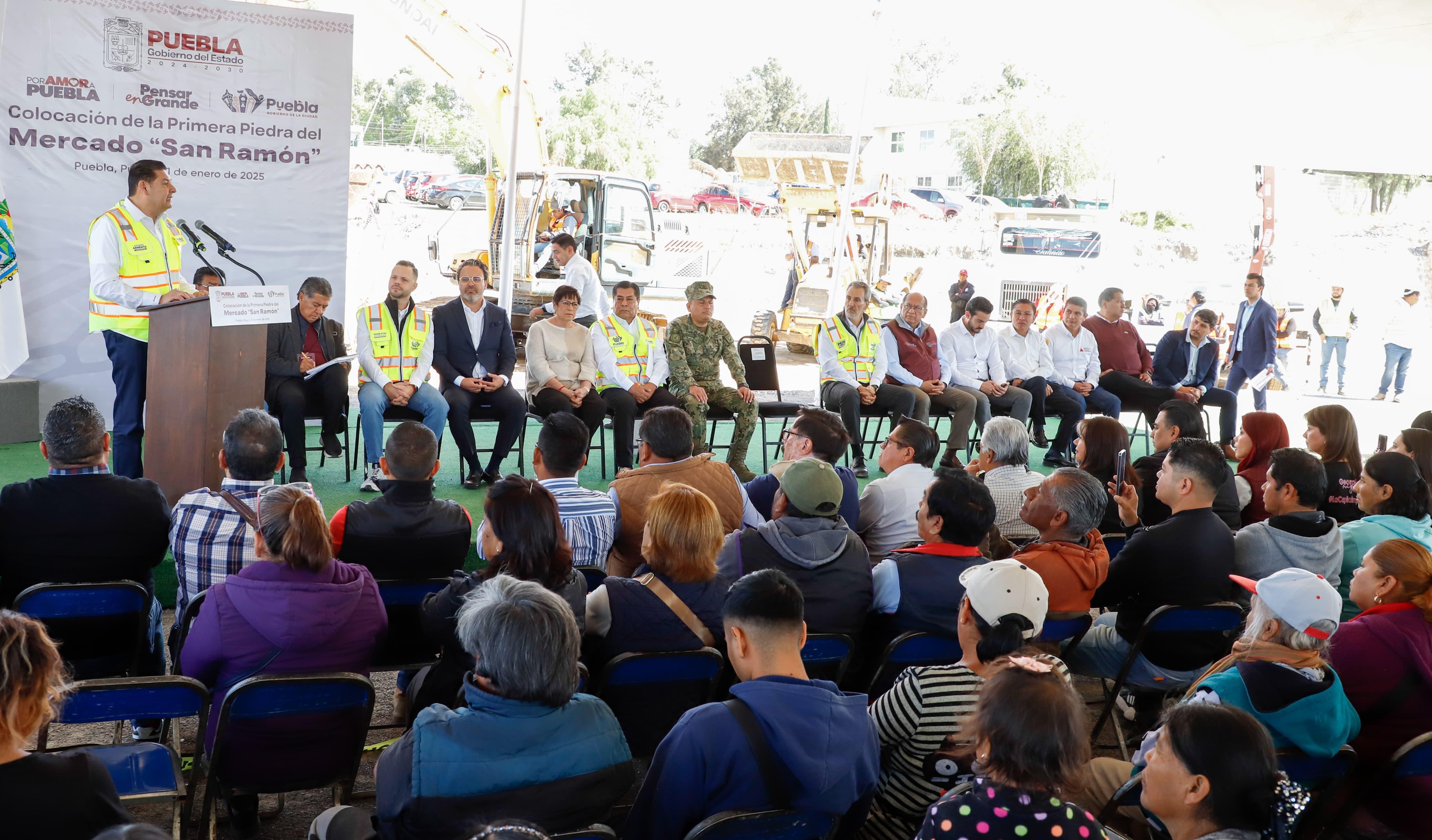 CIUDAD DE PUEBLA, Pue.- El gobernador Alejandro Armenta y el presidente municipal, Pepe Chedraui Budib, colocaron la primera piedra de la construcción del Mercado “San Ramón”, una obra que contará con una inversión total de 80 millones 379 mil 612 pesos, de los cuales 60.3 millones corresponden a inversión estatal y 20 millones a recursos municipales.