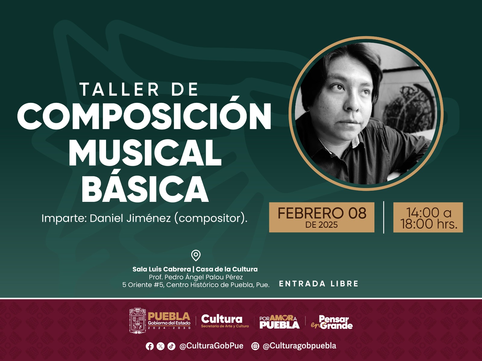CIUDAD DE PUEBLA, Pue.- La Secretaría de Arte y Cultura ofrecerá un taller gratuito de composición musical con tecnología, en cumplimiento de la encomienda del gobernador Alejandro Armenta de fortalecer e impulsar el talento artístico en la entidad. La actividad se llevará a cabo en la Sala Teatro “Luis Cabrera” de la Casa de la Cultura “Profesor Pedro Ángel Palou Pérez”, ubicada en 5 Oriente número 5, en el Centro Histórico.