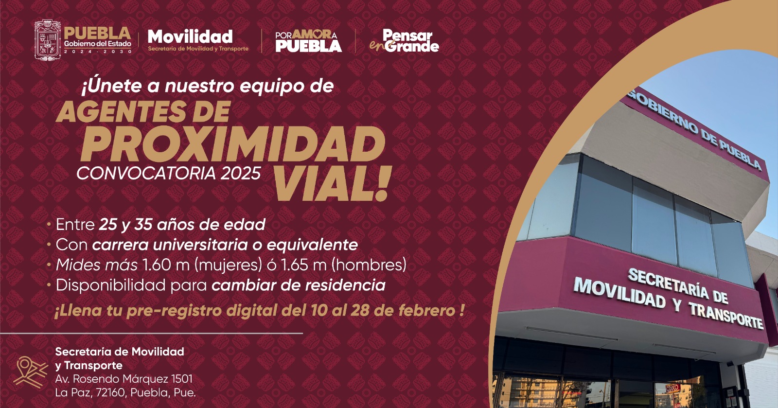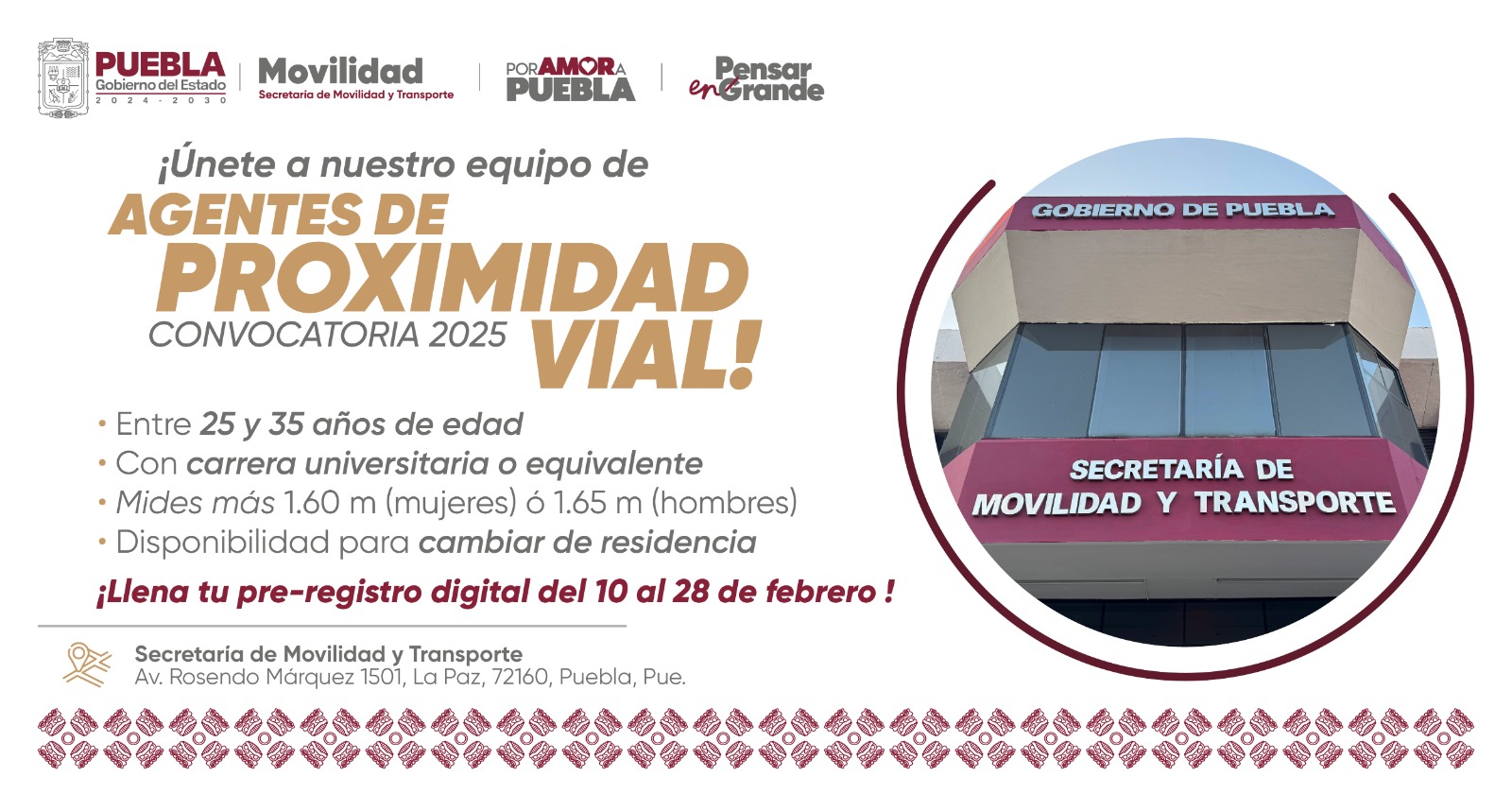 CIUDAD DE PUEBLA, Pue.- En cumplimiento de la estrategia del gobernador humanista Alejandro Armenta para fortalecer la seguridad vial en el estado, la Secretaría de Movilidad y Transporte (SMT) lanza la Convocatoria 2025 para integrar a nuevos Agentes de Proximidad Vial, a quienes se les brindará capacitación y oportunidades de crecimiento profesional.