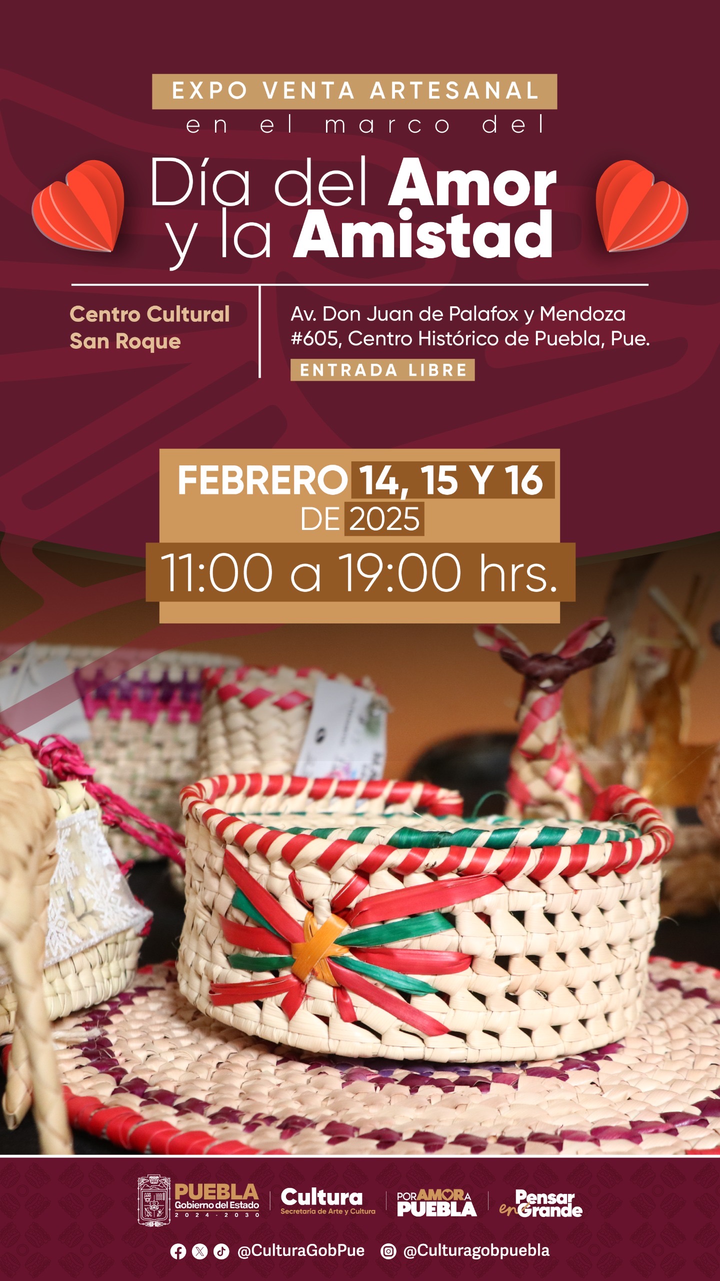 Del viernes 14 al domingo 16 de febrero, habrá dos expoventas en las que participarán más de 25 artesanas y artesanos de diversas regiones de la entidad, con productos textiles y agroindustriales como bolsas, bordados, chocolate y dulces típicos, entre otros alusivos a la celebración.