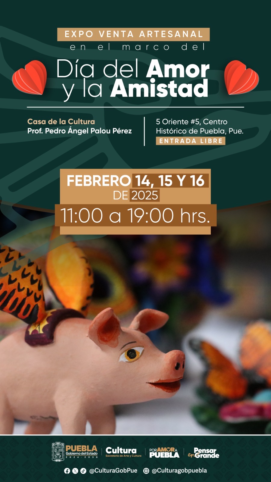 CIUDAD DE PUEBLA, Pue.- Con el propósito de fomentar espacios de convivencia y promover el quehacer artístico y cultural del estado, el Gobierno de Puebla, encabezado por el gobernador Alejandro Armenta, a través de la Secretaría de Arte y Cultura, organiza una serie de actividades en dos sedes del Centro Histórico para celebrar el Día de San Valentín.