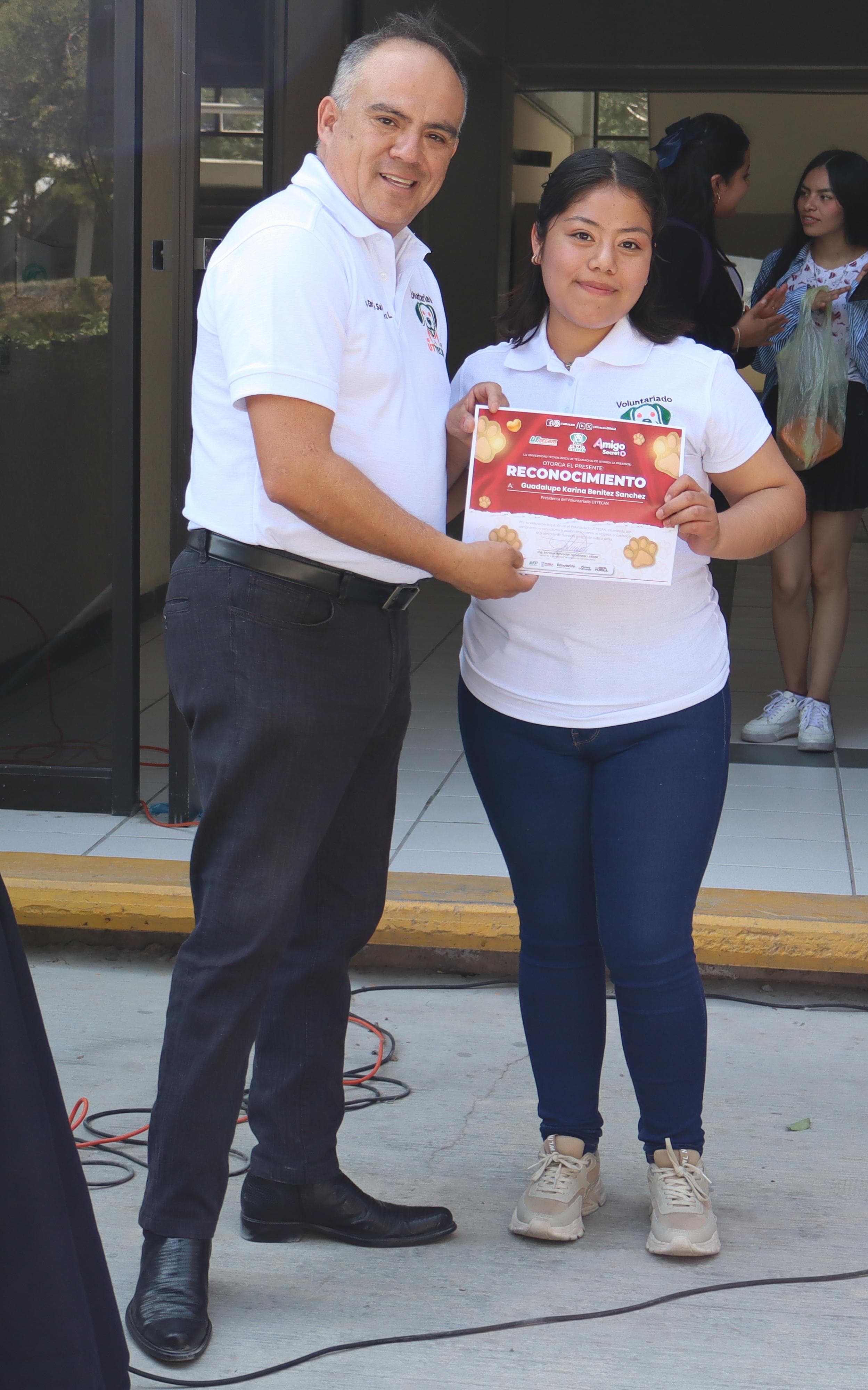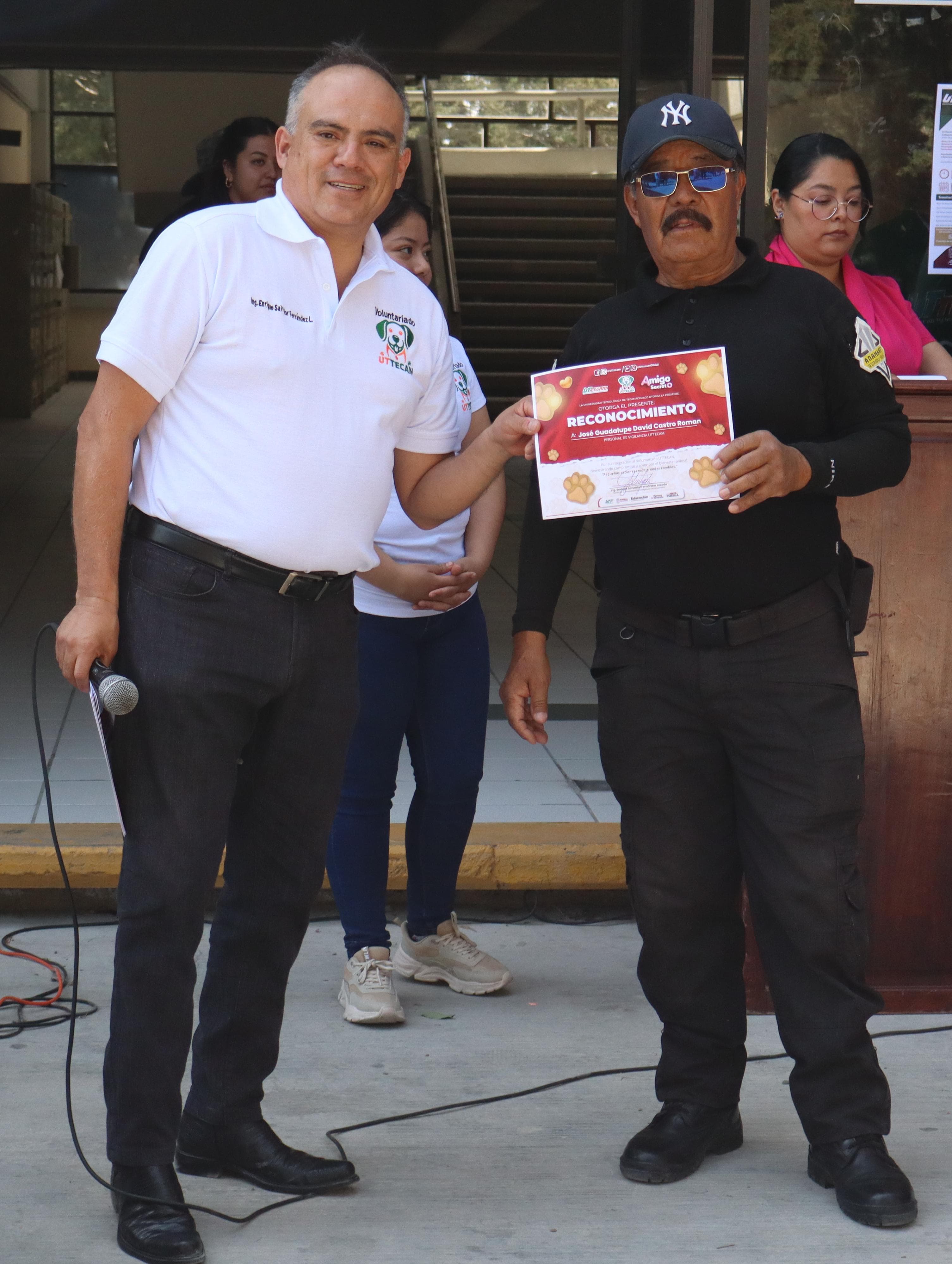 La presidenta del Voluntariado de la UTTecam, Guadalupe Karina Benítez Sánchez, compartió un mensaje a las y los alumnos del Programa Educativo de Alimentos, sobre la importancia de generar conciencia y brindar protección a los animales que nos rodean. Además, se otorgó un reconocimiento al personal de vigilancia, por su gran compromiso con el cuidado de los perritos que forman parte de la universidad.