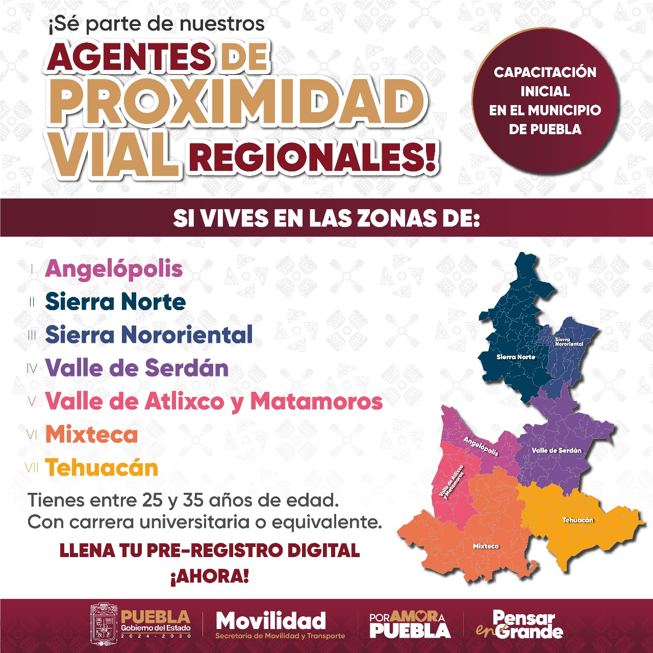 CIUDAD DE PUEBLA, Pue.- El gobierno humanista encabezado por el mandatario Alejandro Armenta, a través de la Secretaría de Movilidad y Transporte (SMT), convoca a las y los interesados de las regiones de la Sierra Norte, Sierra Nororiental, Valle de Serdán, Angelópolis, Valle de Atlixco y Matamoros, Mixteca y Tehuacán a integrarse como Agentes de Proximidad Vial al interior del estado.
