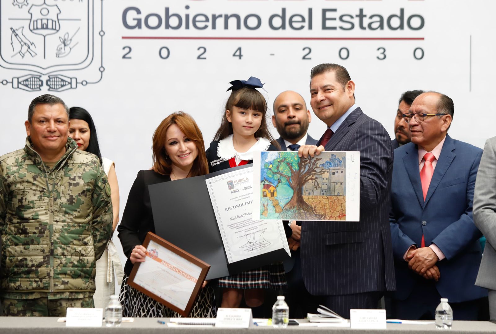 Durante la mañanera, el gobernador Alejandro Armenta, entregó cuatro reconocimientos, el primero a la niña Ana Paula Palacios, por obtener el primer lugar en la categoría “A” del Concurso Nacional de Dibujo y Pintura Infantil Juvenil, donde la pequeña representó la evolución de lo rural a lo urbano.
