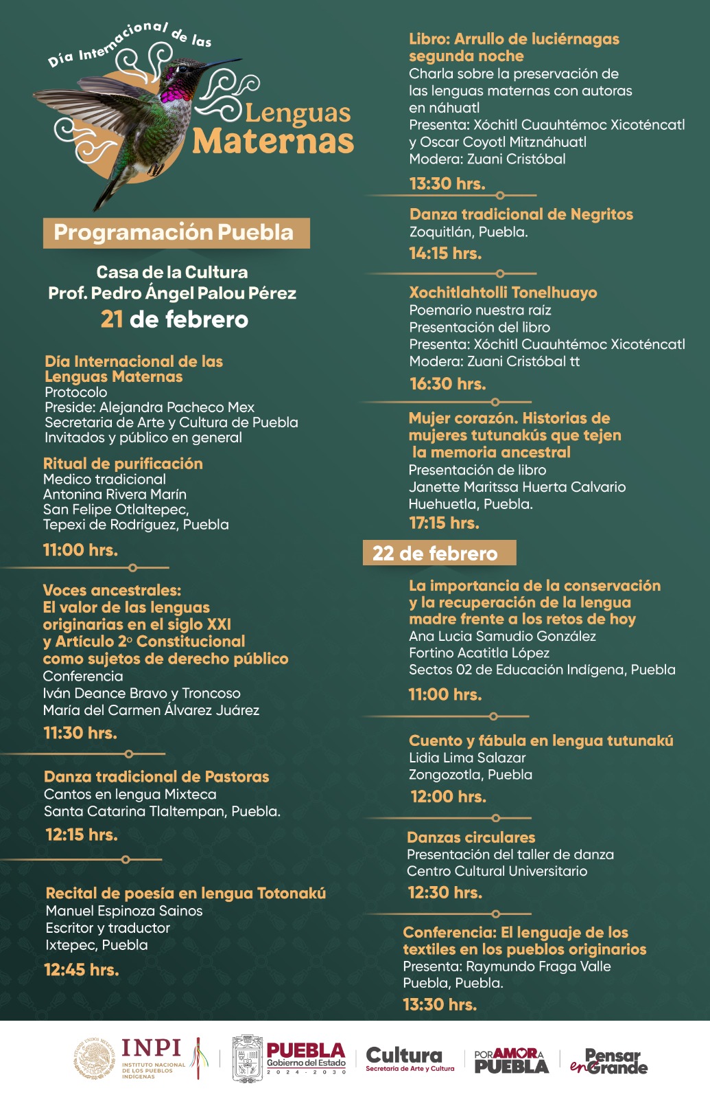 CIUDAD DE PUEBLA, Pue.- Con una programación gratuita, el gobierno estatal, por medio de la Secretaría de Arte y Cultura, conmemorará el Día Internacional de las Lenguas Maternas (21 de febrero) en la Casa de la Cultura “Profesor Pedro Ángel Palou Pérez”, ubicada en la Calle 5 Oriente número 5, Centro Histórico.
