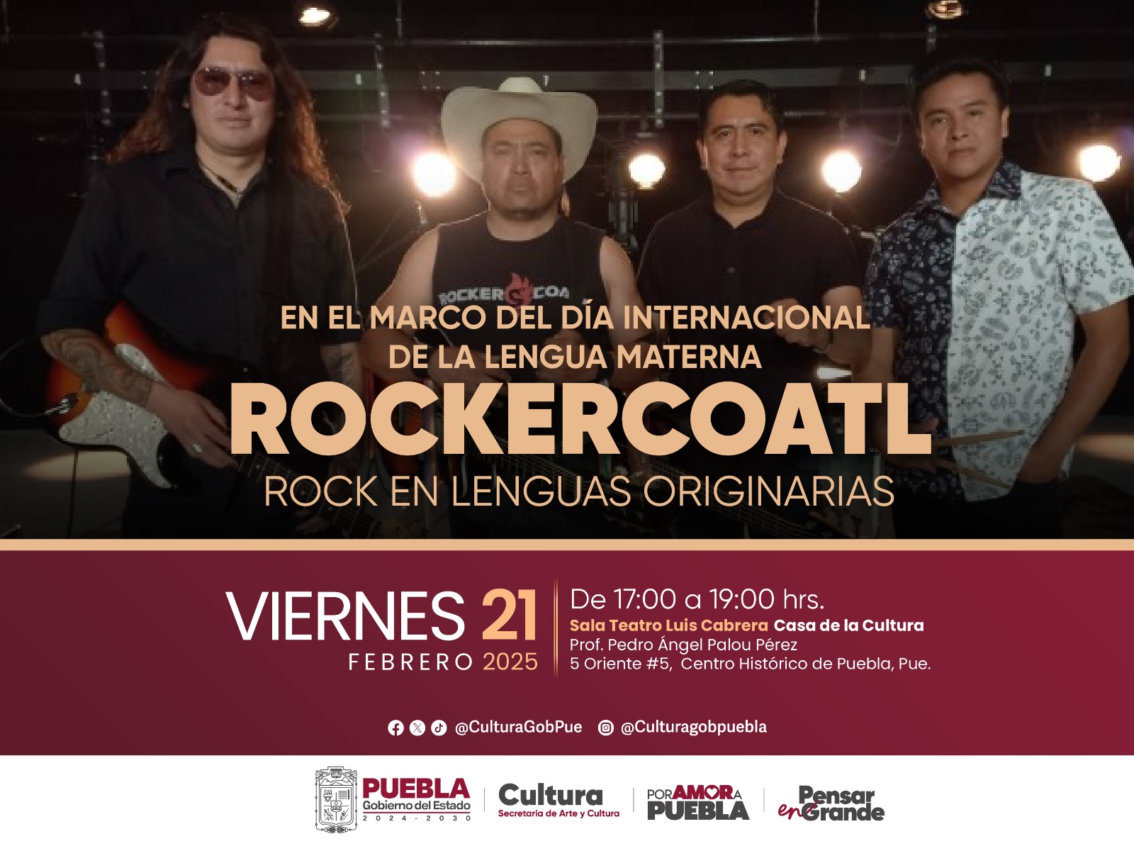 CIUDAD DE PUEBLA, Pue.- En el marco del Día Internacional de la Lengua Materna, el Gobierno del Estado de Puebla, encabezado por el gobernador Alejandro Armenta, a través de la Secretaría de Arte y Cultura, y en colaboración con la banda poblana de rock en náhuatl “Rockercoatl”, celebrará el 25 aniversario de esta agrupación con un concierto de entrada libre.