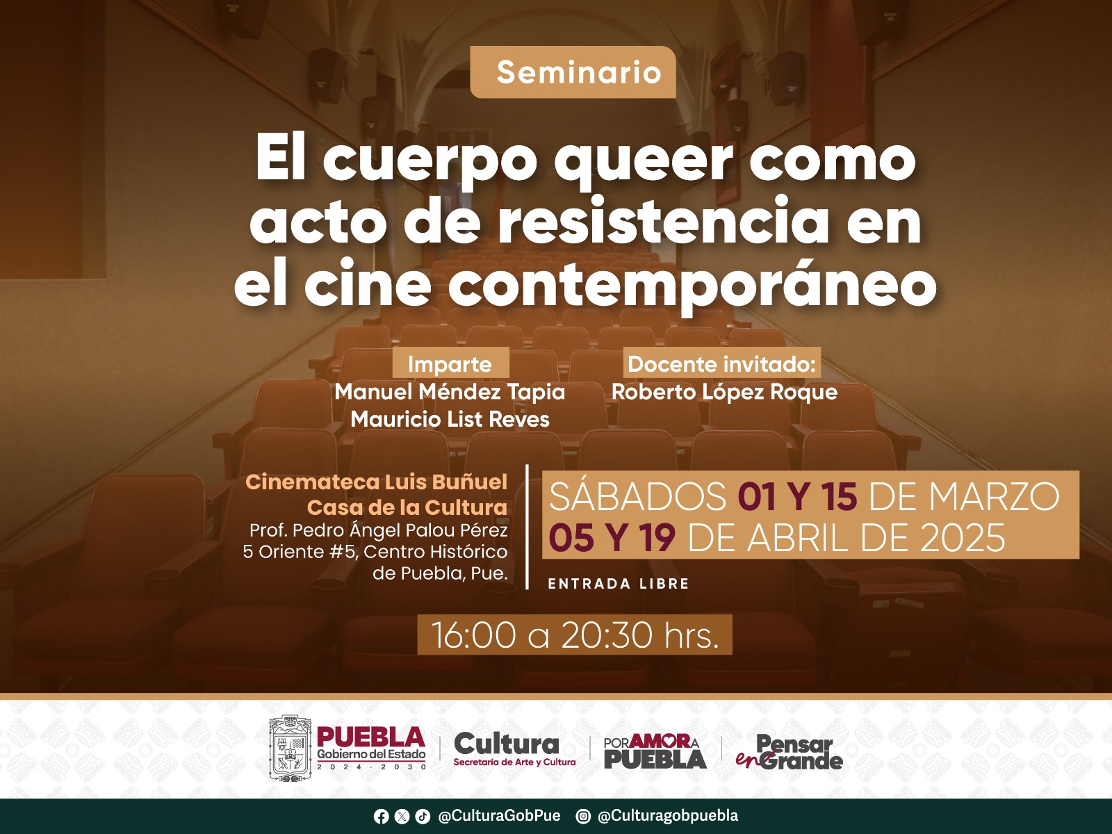CIUDAD DE PUEBLA, Pue.- El gobierno estatal encabezado por Alejandro Armenta, a través de la Secretaría de Arte y Cultura llevará a cabo el seminario internacional “El cuerpo queer como acto de resistencia en el cine contemporáneo. Identidades diversas, espacios y comunidad.”, que se llevará a cabo los sábados 01 y 15 de marzo, y 05 y 19 de abril, de 16:00 a 20:30 horas, en la Cinemateca “Luis Buñuel”.