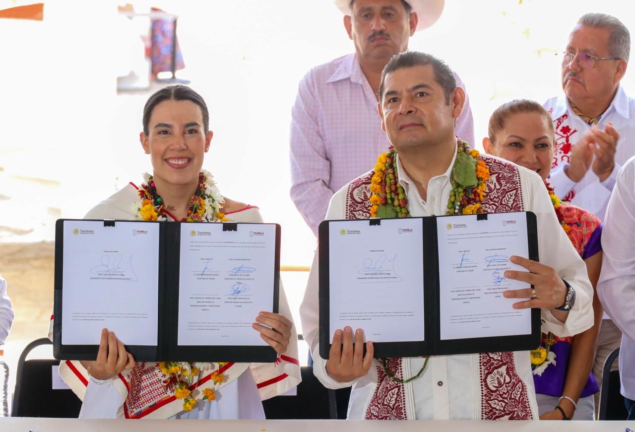 CUETZALAN DEL PROGRESO, Pue.- Con el objetivo de fortalecer el turismo comunitario en Puebla, el gobernador Alejandro Armenta y la secretaria de Turismo del Gobierno Federal, Josefina Rodríguez Zamora, signaron un convenio para promover el desarrollo equitativo en el estado y difundir la riqueza cultural, artística y turística.