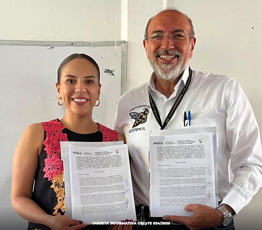 Pantepec, Puebla. El Colegio de Estudios Científicos y Tecnológicos del Estado de Puebla (CECyTE Puebla), a través de su directora general, Estebi Fernández, firmó un convenio de colaboración con la Universidad Xicotepetl, con el propósito de fortalecer la formación académica y profesional de las y los estudiantes.