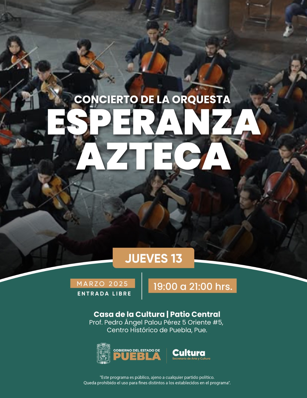 CIUDAD DE PUEBLA, Pue.- La Secretaría de Arte y Cultura del Gobierno del Estado de Puebla invita al concierto gratuito de la Orquesta del Instituto Superior de Música Esperanza Azteca (ISMEA) que se realizará en el patio central de la Casa de la Cultura “Profesor Pedro Ángel Palou Pérez”, ubicado en la 5 Oriente No. 5 del Centro Histórico.