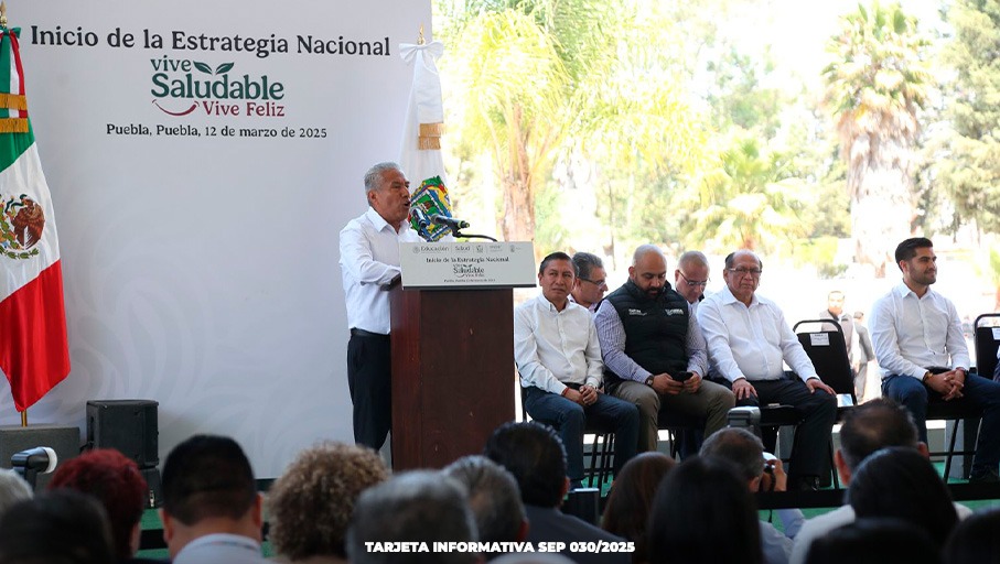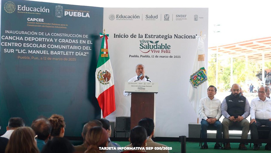 CIUDAD DE PUEBLA, Pue.- La Secretaría de Educación federal y el Gobierno del Estado de Puebla, presentaron la estrategia "Vive Saludable, Vive Feliz" en el Centro Escolar Comunitario del Sur, Lic. Manuel Bartlett Díaz. El propósito de la campaña, es procurar espacios saludables para las y los estudiantes de nivel básico.