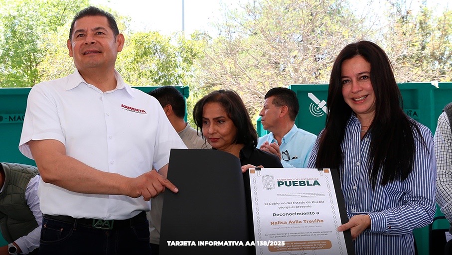 Como parte del evento, el gobernador Alejandro Armenta entregó un reconocimiento a Nalisa Ávila Treviño, presidenta y socia fundadora de Green Carson A.C. por su labor a favor del medio ambiente en Puebla.