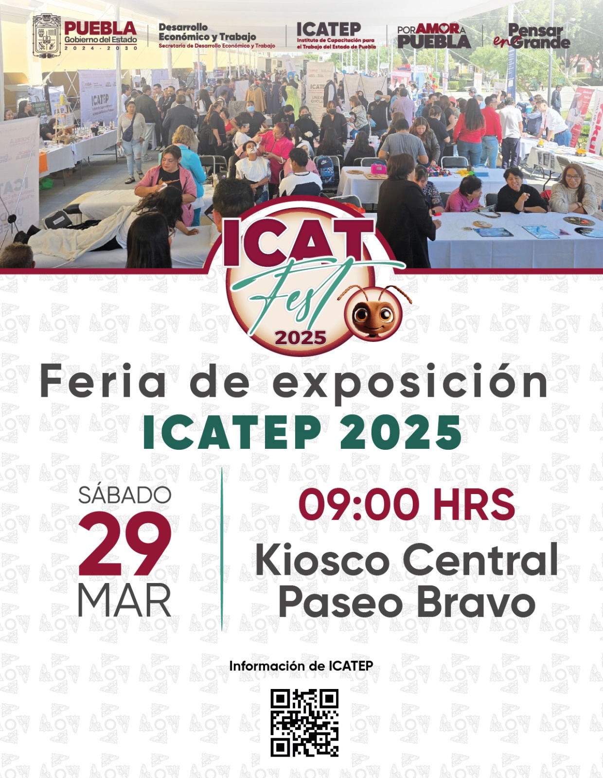 CIUDAD DE PUEBLA, Pue.- El Gobierno del Estado de Puebla, que lidera Alejandro Armenta, busca fortalecer las competencias laborales y fomentar el emprendimiento en diversas áreas productivas a favor de las y los poblanos, por tal motivo, a través del Instituto de Capacitación para el Trabajo del Estado de Puebla (ICATEP), llevará a cabo el “ICATFEST”, una feria de exposición de cursos y productos. El evento se celebrará el sábado 29 de marzo, en el horario de 9 a 15 horas, en el Kiosco del Paseo Bravo.