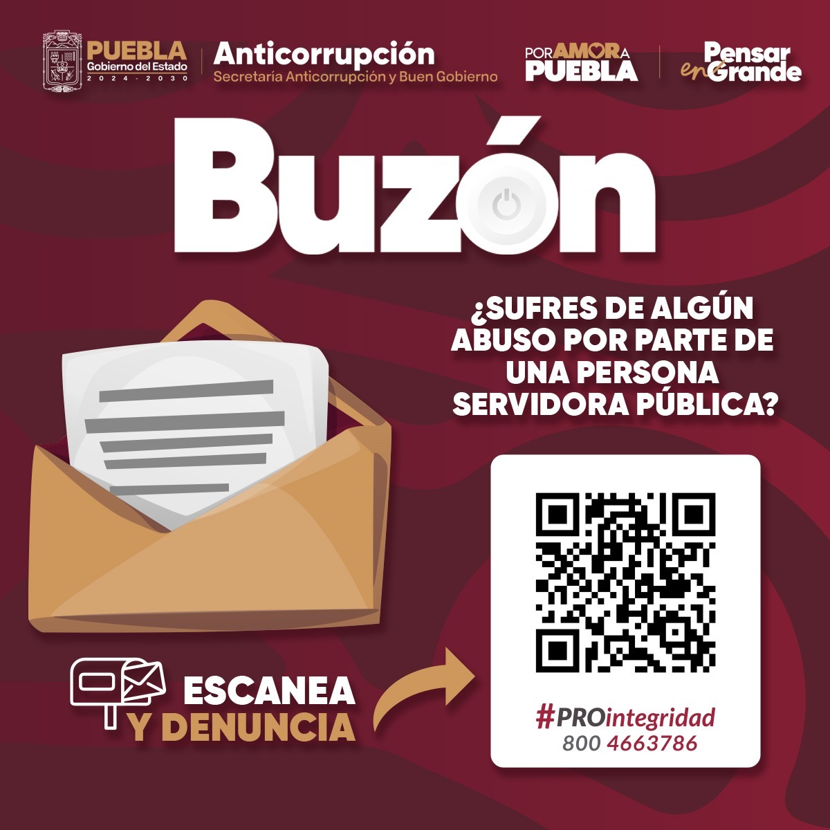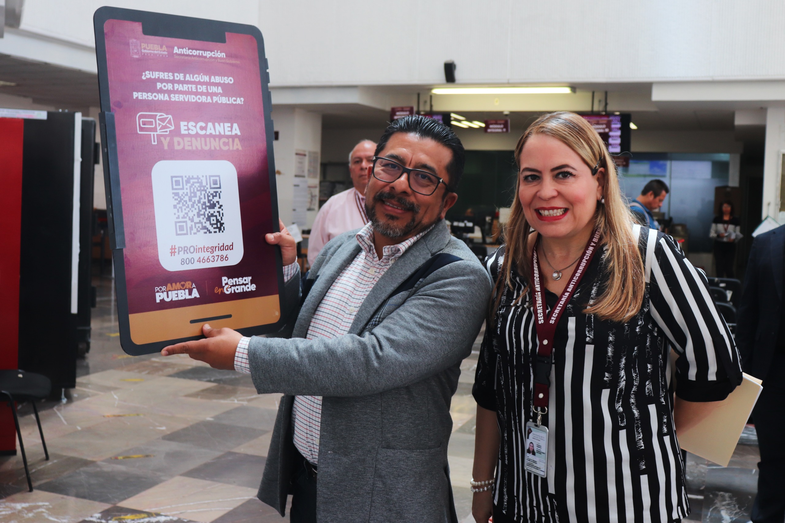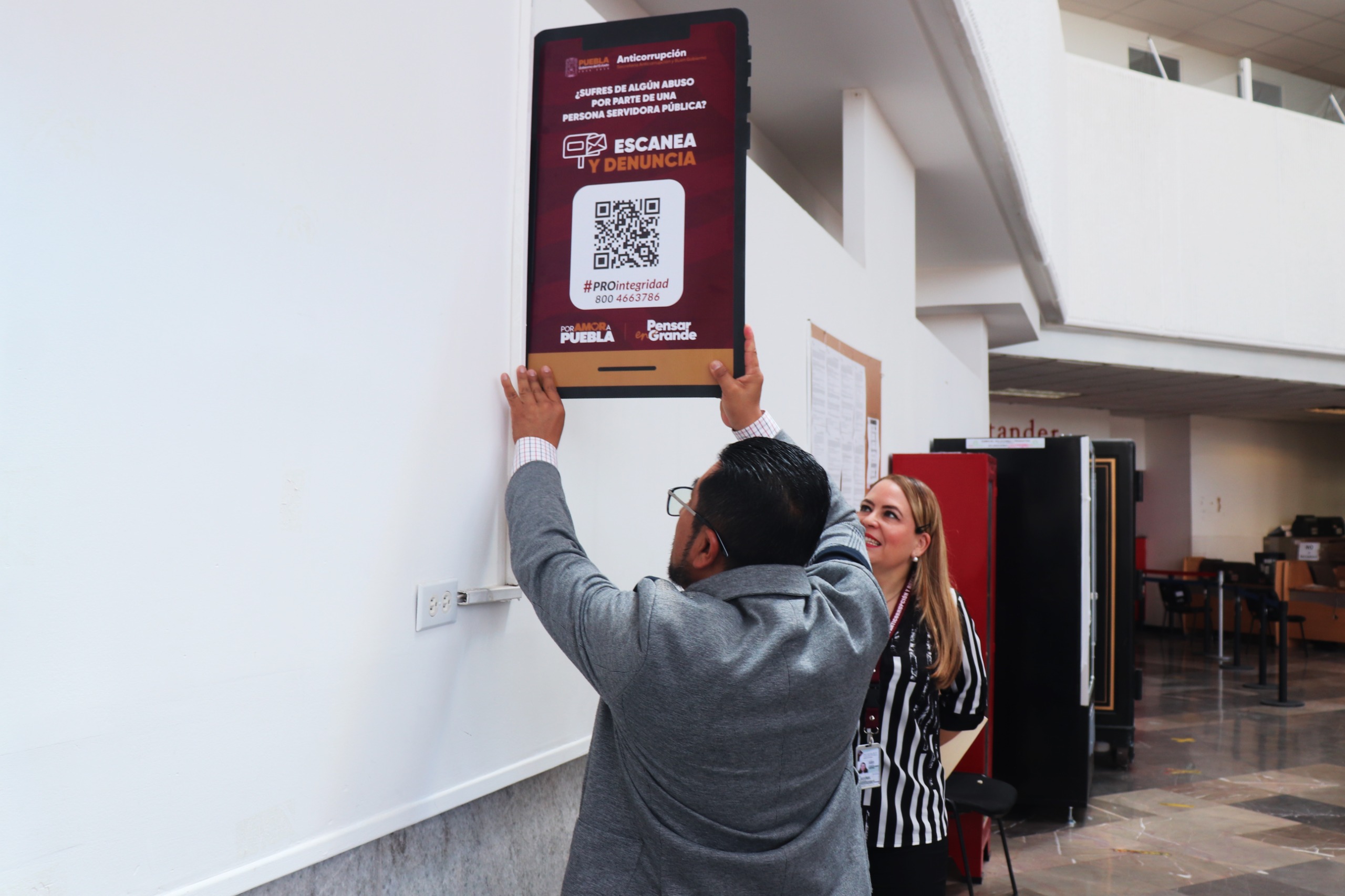 CIUDAD DE PUEBLA, Pue. - El Gobierno del Estado de Puebla, a través de la Secretaría de Anticorrupción y Buen Gobierno, llevó a cabo la colocación de buzones de quejas y denuncias para fortalecer los mecanismos que contribuyan a evitar actos de corrupción por parte de personas servidoras públicas a nivel estatal con el compromiso de consolidar valores como la transparencia y la integridad.