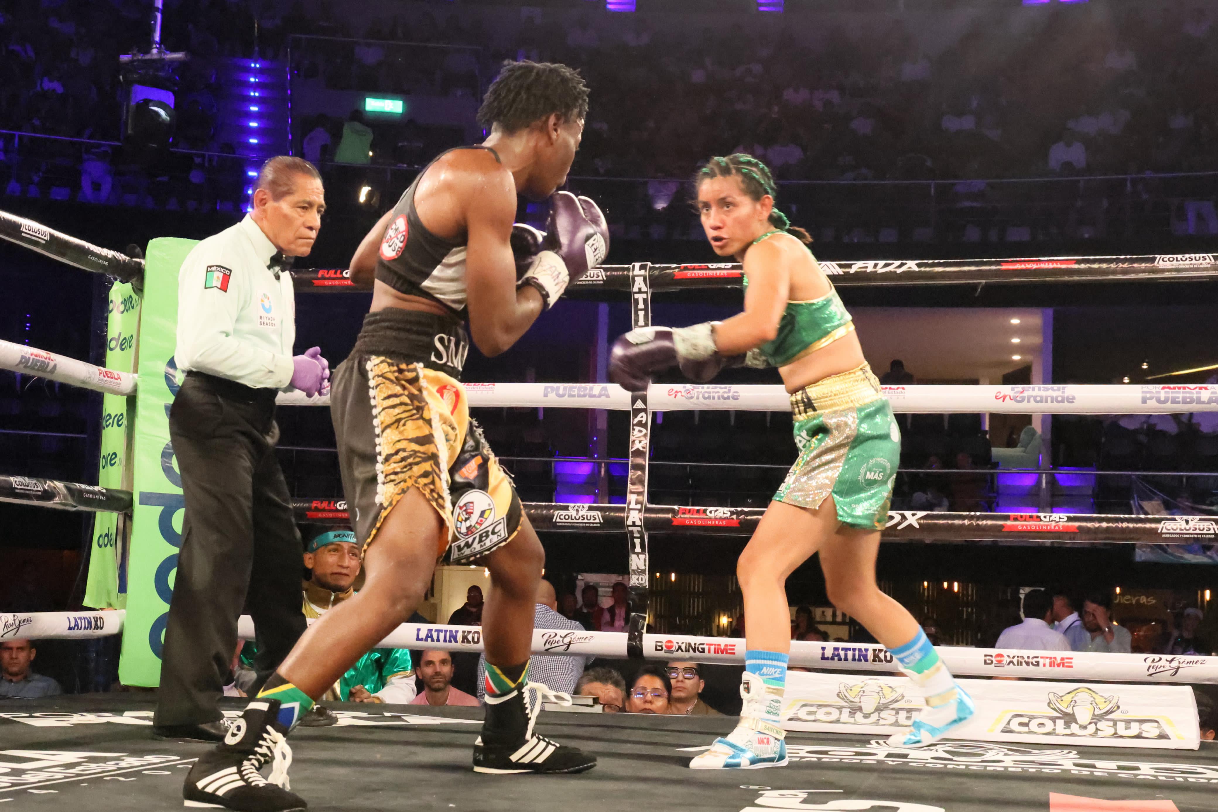 CIUDAD DE PUEBLA, Pue.- La poblana Gaby “La Bonita” Sánchez obtuvo con éxito su cinturón, peso mosca de Consejo Mundial de Boxeo al derrotar por decisión unánime a la sudafricana Simangele “La Leona” Hadebe, ante un abarrotado Auditorio GNP que registró un lleno.