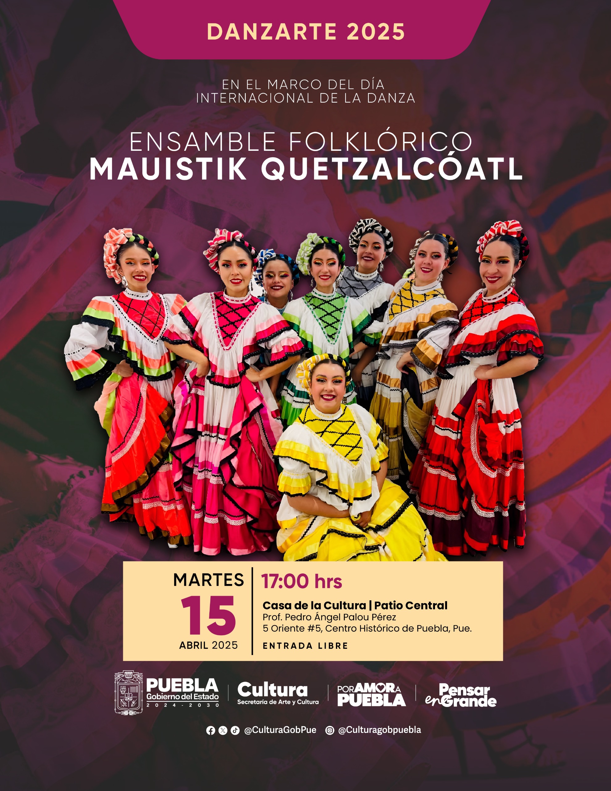 CIUDAD DE PUEBLA, Pue.- Con motivo de la celebración del Día Mundial de la Danza, que se conmemora el 29 de abril, el Gobierno del Estado de Puebla, a través de la Secretaría de Arte y Cultura, extiende una cordial invitación a las y los poblanos al Festival Danzarte 2025.
