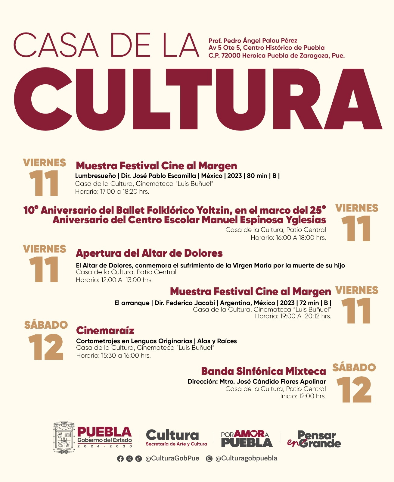 Ese mismo día, a partir de las 12:00 horas, la Casa de la Cultura “Profesor Pedro Ángel Palou Pérez”, ubicada en la 5 Oriente No. 5, también en el Centro Histórico, abrirá al público la exposición del Altar de Dolores, que incluirá la presentación del Ballet Folklórico Yoltzen a las 16:00 horas, como parte del aniversario de esta agrupación.