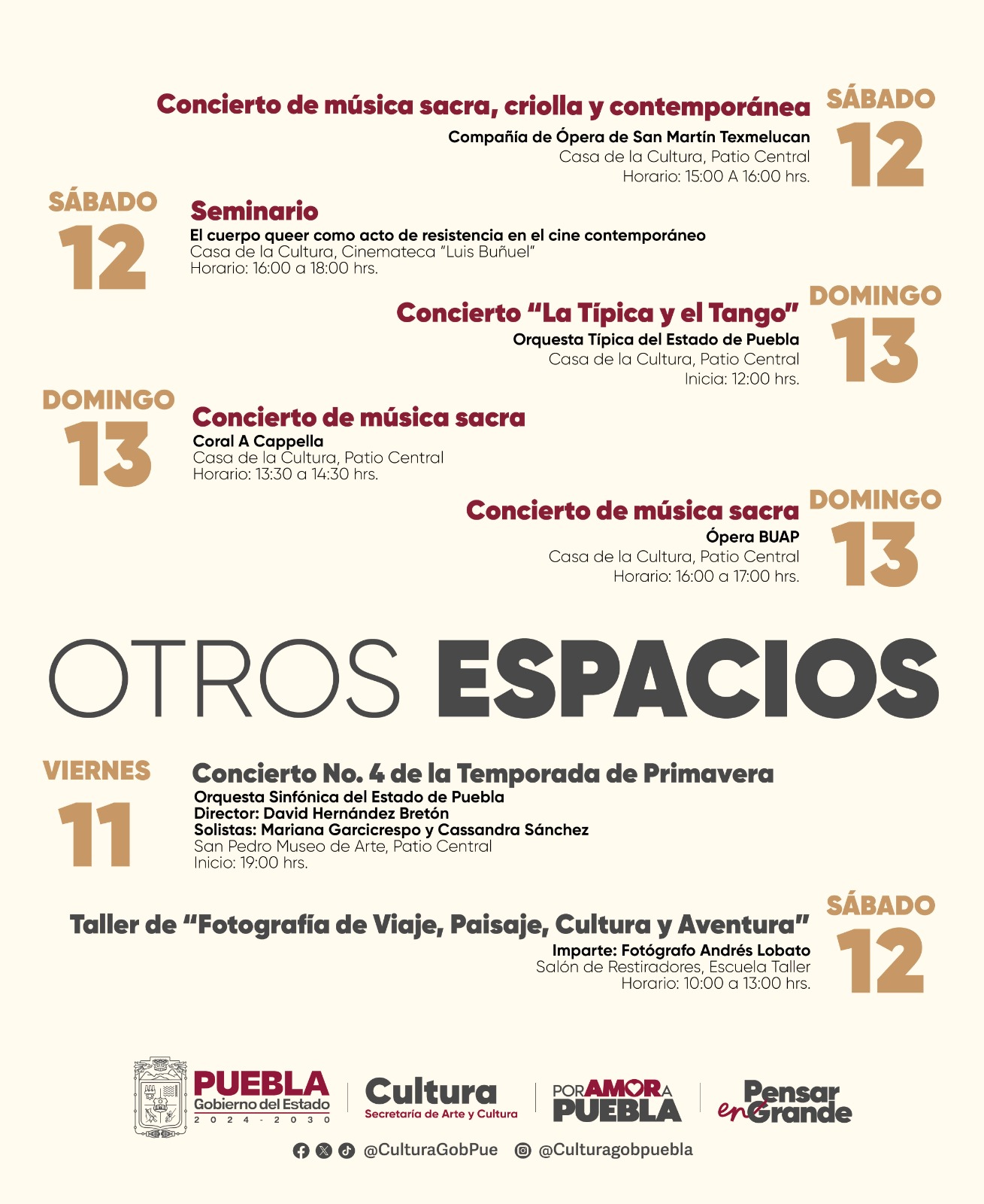 Las actividades iniciarán el viernes 11 de abril con el Concierto No. 4 de la Temporada de Primavera de la Orquesta Sinfónica del Estado de Puebla (OSEP), el cual se llevará a cabo en el San Pedro Museo de Arte a las 19:00 horas. La presentación contará con la participación de las solistas Mariana Garcicrespo y Cassandra Sánchez, bajo la dirección de David Hernández Bretón. El recinto se ubica en la 4 Norte No. 203, en el Centro Histórico.