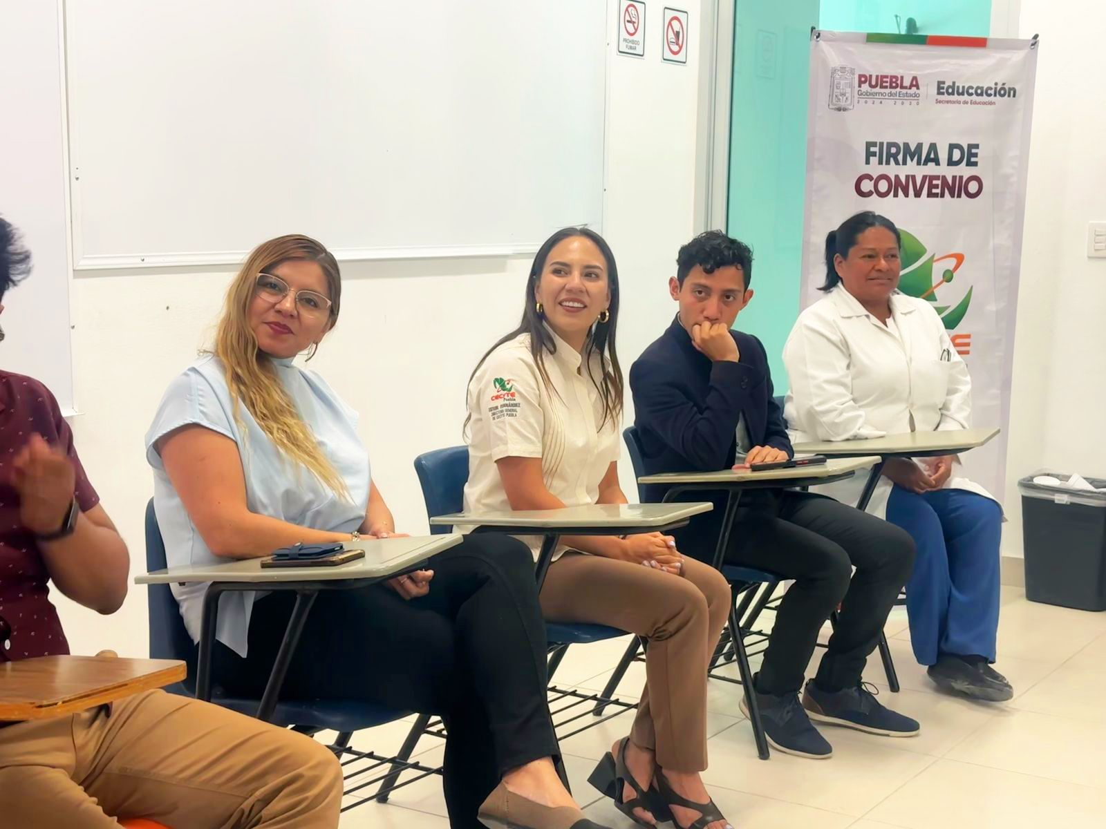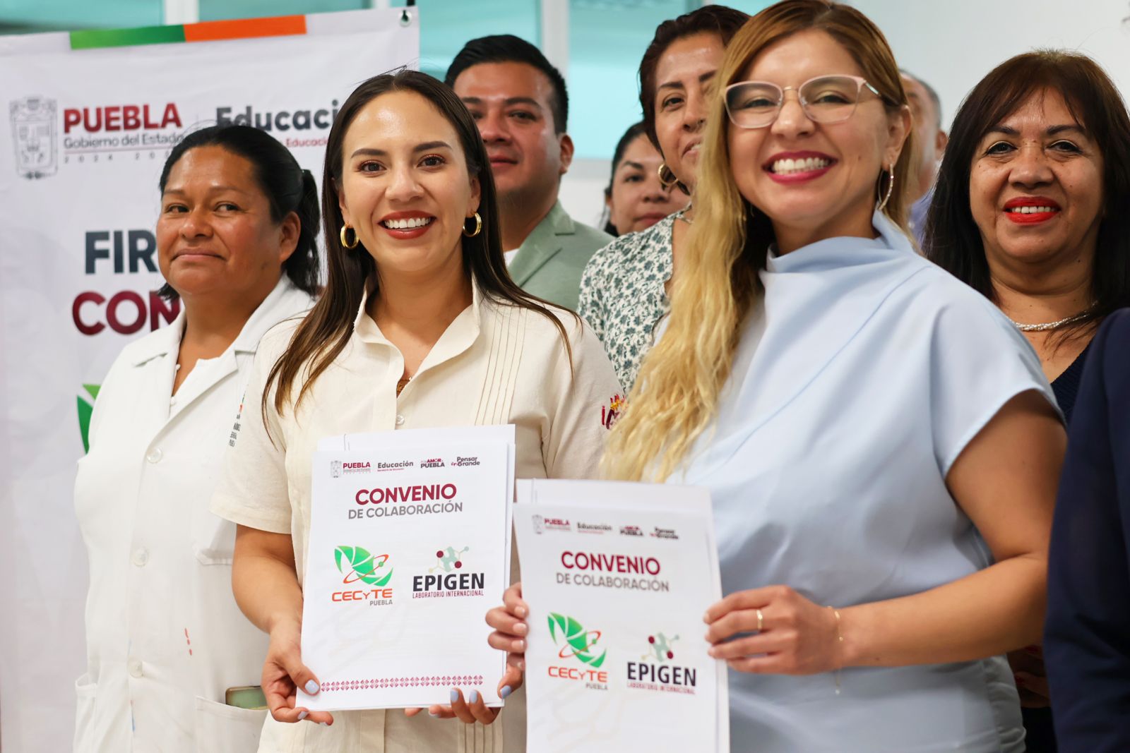 La firma se realizó en el campus de Ciencias de la BUAP, donde estuvieron presentes la directora general de CECyTE Puebla, Estebi Fernández, y la directora del laboratorio EPIGEN e investigadora de Harvard, Karla Rubio.