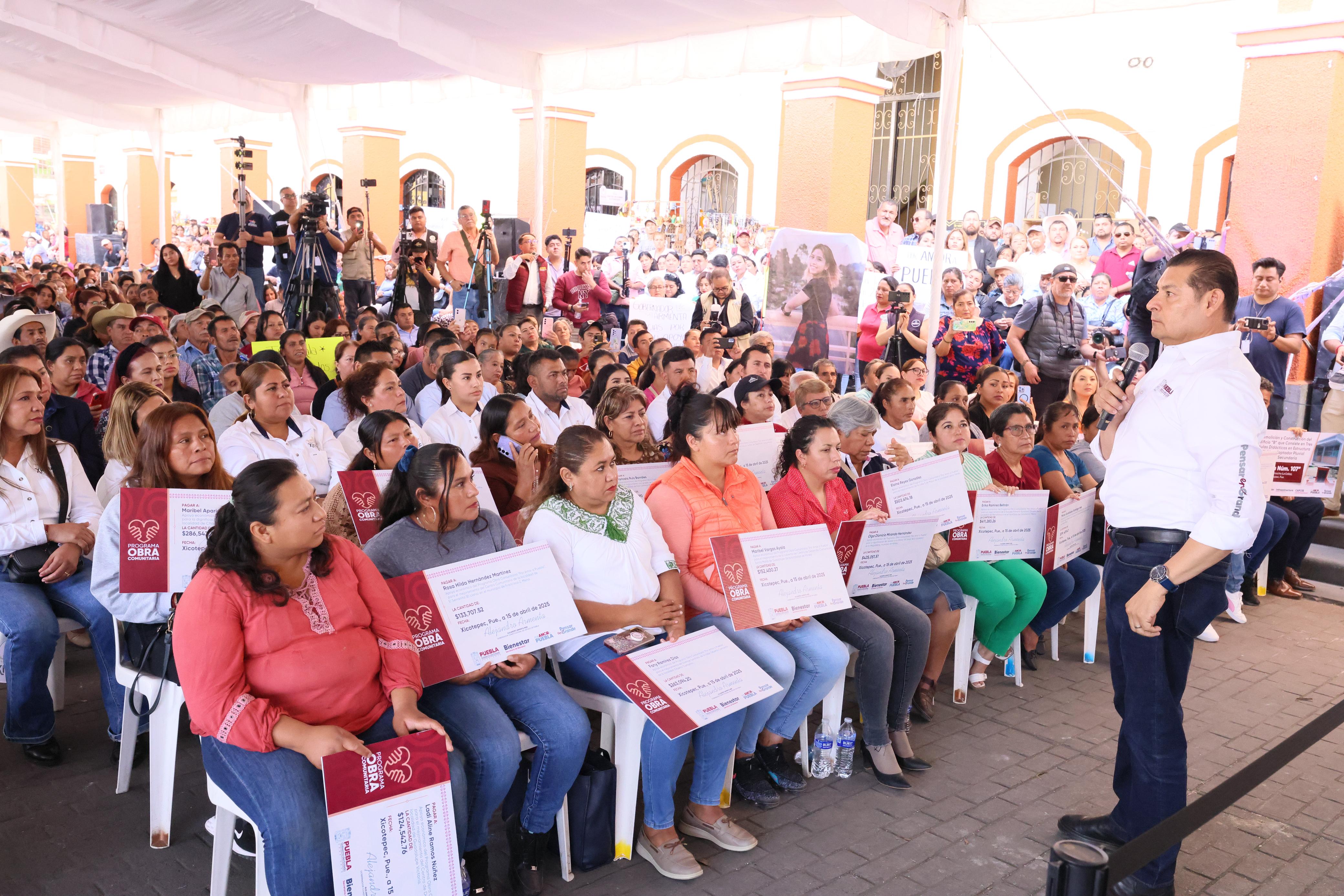 XICOTEPEC DE JUÁREZ, Pue.- El gobernador Alejandro Armenta hizo la entrega de 41 proyectos, por 13 millones de pesos, para fortalecer el desarrollo social a través de los comités encabezados por mujeres tesoreras, a través de quienes la población prioriza las obras que requieren. Destacó que hasta ahora se han realizado más de mil 200 asambleas comunitarias.