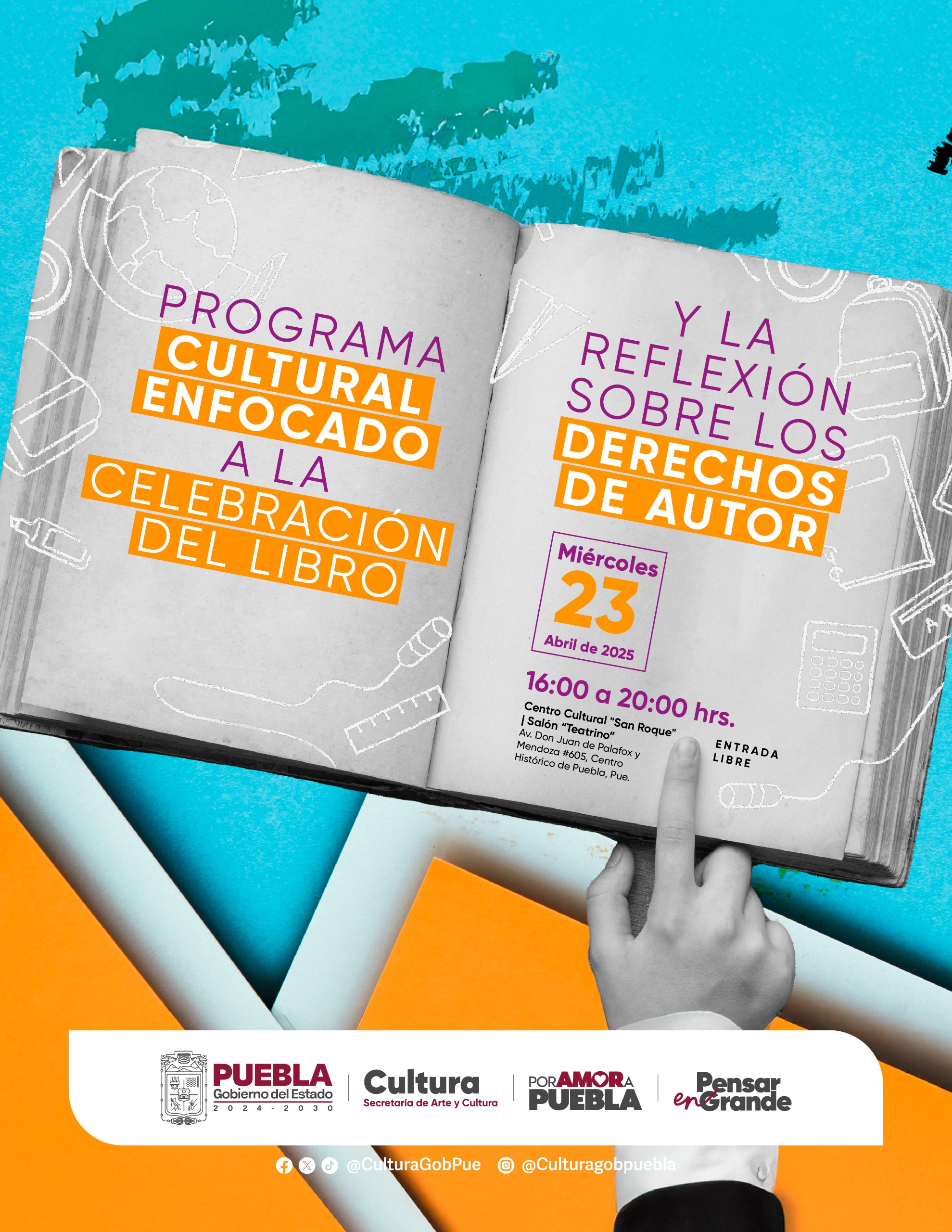 En el marco del Día Mundial del Libro y del Derecho de Autor, que se conmemora el 23 de abril, la administración que encabeza Alejandro Armenta fomenta esta programación, con el objetivo de reconocer y celebrar la importancia y la creatividad que gira en torno a los libros. Los detalles de estas actividades pueden consultarse en las redes sociales Facebook: Secretaría de Cultura Puebla e Instagram: @culturagobpuebla.