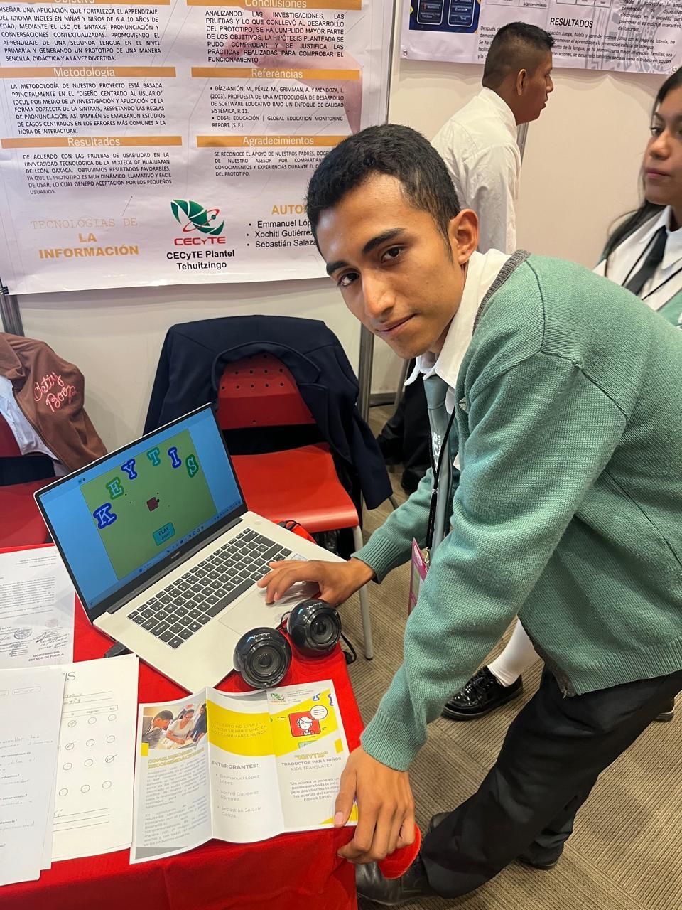 Del plantel CECyTE Tehuitzingo, los estudiantes Xóchitl Gutiérrez Ramírez, Sebastián Salazar García y Emmanuel López López e Itzel Aruko Merino González presentan el proyecto “Keytis”, un traductor de inglés para niñas y niños de primaria en la región mixteca. Esta herramienta combina imágenes y métodos pedagógicos adaptados al contexto local, lo que facilita el aprendizaje del idioma desde la niñez. También participa en la categoría de Prototipos Informáticos.