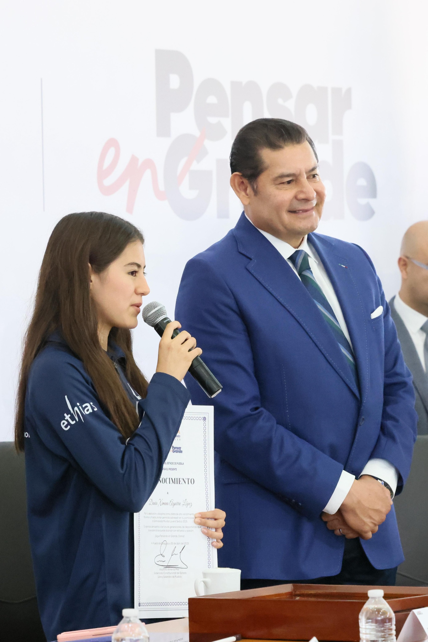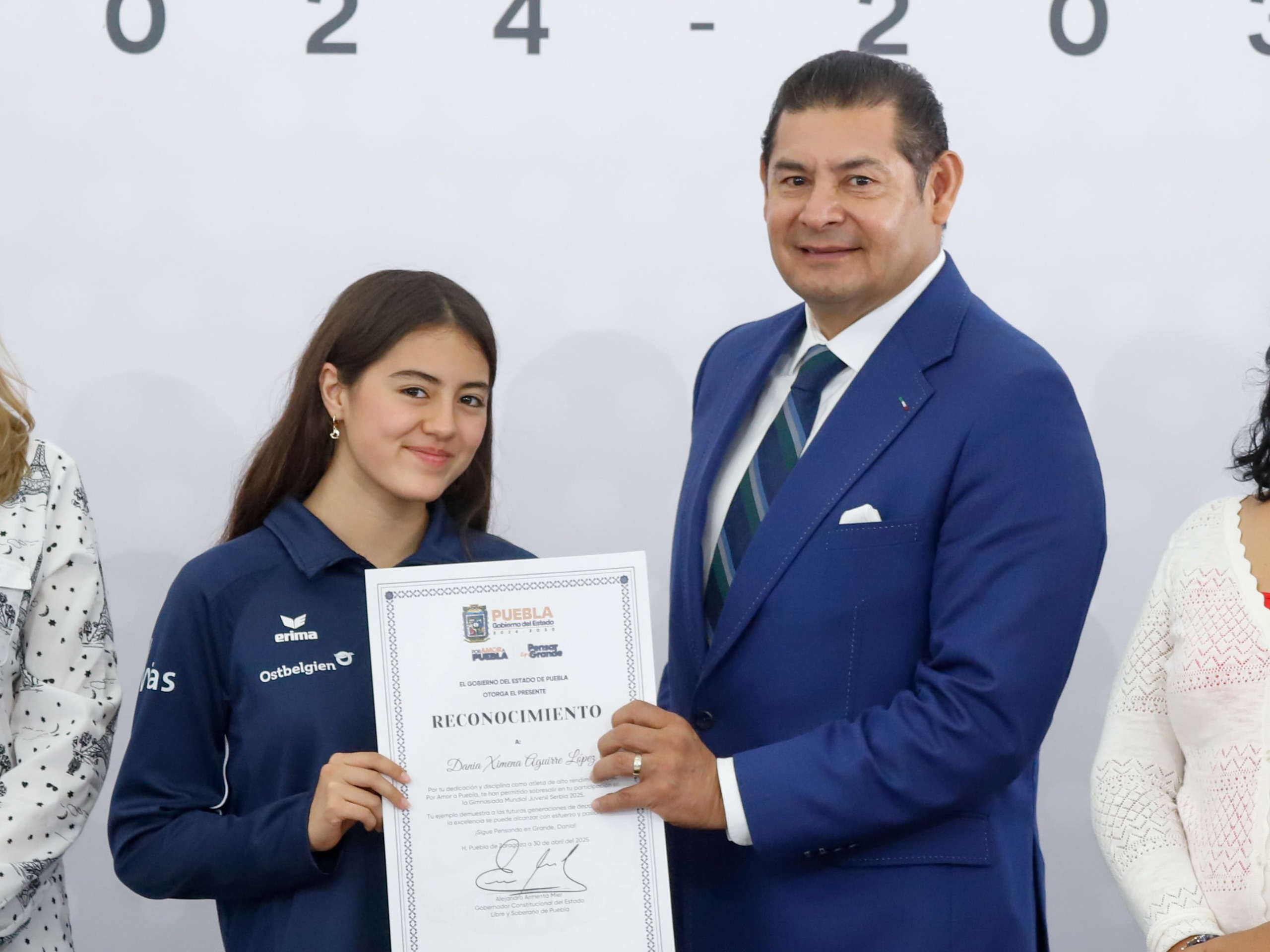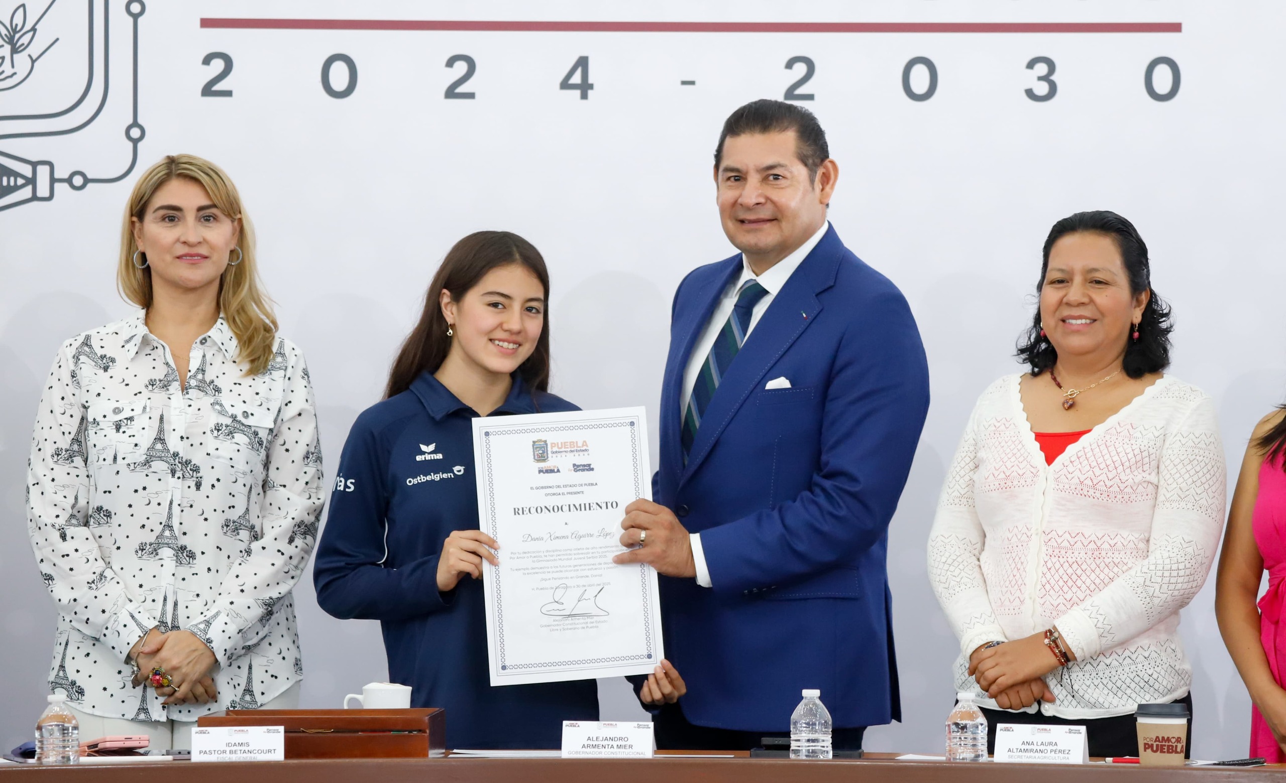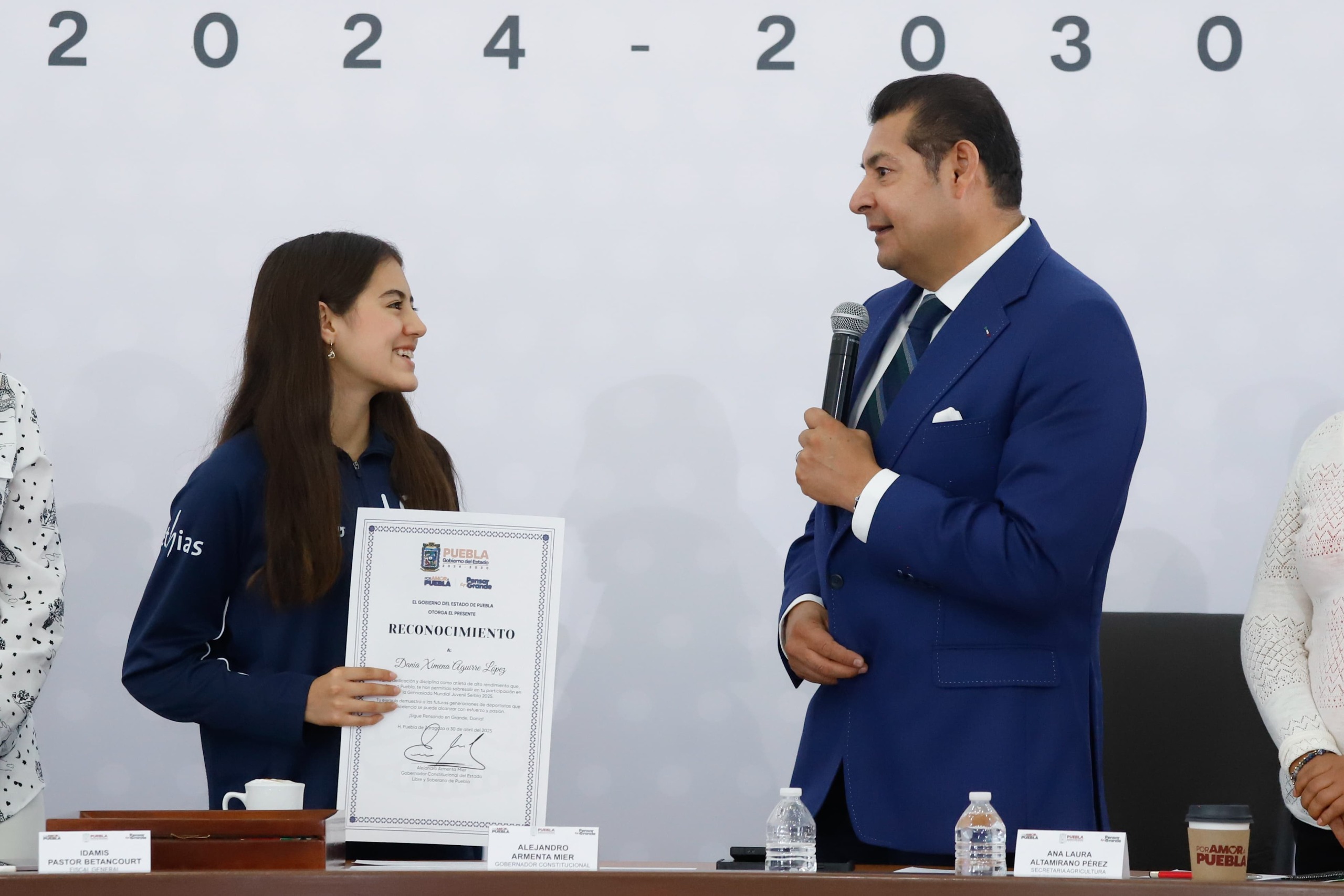 CIUDAD DE PUEBLA, Pue.- Con el objetivo del Gobierno del Estado de consolidar a Puebla como una “Tierra de campeonas y campeones”, el gobernador Alejandro Armenta entregó un reconocimiento a la nadadora Dania Ximena Aguirre López, por su sobresaliente participación en la Gymnasiada Mundial Juvenil 2025, celebrada en Zlatibor, Serbia.