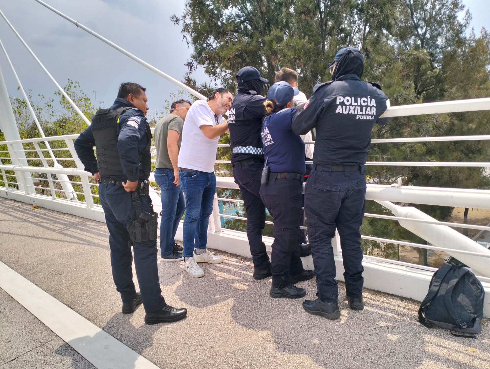 CIUDAD DE PUEBLA, Pue.- Gracias a la pronta intervención de elementos de la Policía Auxiliar asignados al servicio de Convenciones y Parques, el Gobierno del Estado de Puebla logró evitar que un masculino atentara contra su vida en el puente elevado del Parque del Arte.