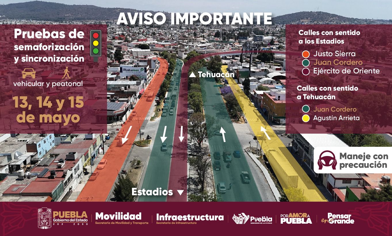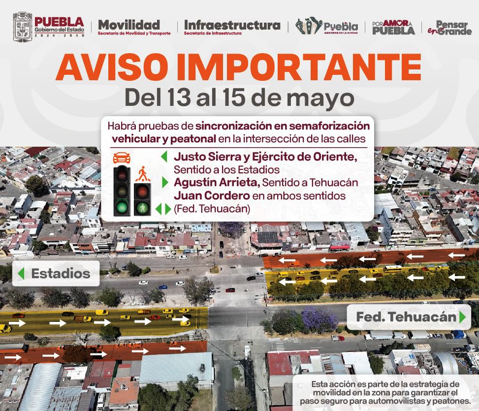 CIUDAD DE PUEBLA, Pue.- El Gobierno del Estado, a través de las secretarías de Infraestructura y Movilidad y Transporte, en coordinación con el Ayuntamiento de Puebla, sincronizarán semáforos vehiculares y peatonales en las calles Justo Sierra y Ejército de Oriente, sentido a los Estadios; así como en Agustín Arrieta, sentido a Tehuacán y Juan Cordero o Federal a Tehuacán, en ambos sentidos. Esta medida iniciará a las 11:00 horas de este 13 de mayo y concluirá el 15 de mayo.