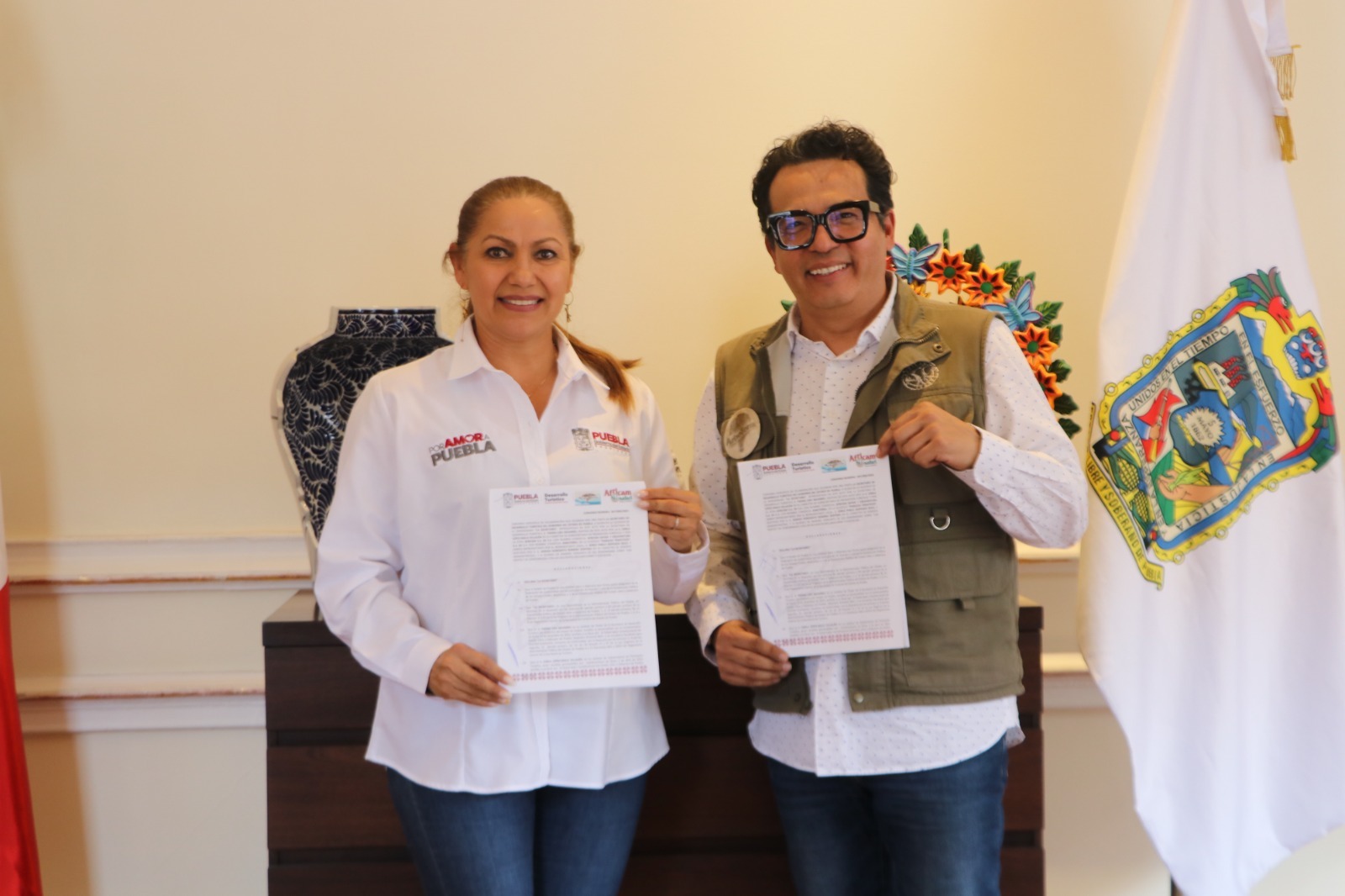 CIUDAD DE PUEBLA, Pue.– Por Amor a Puebla, la secretaria de Desarrollo Turístico, Yadira Lira, junto con el jurídico de esta dependencia, Edgar René García, firmó un convenio marco con el gerente de Ventas de Africam Safari y Arboterra, Raymundo Perroni, con el propósito de intensificar la proyección del estado en el ámbito internacional.