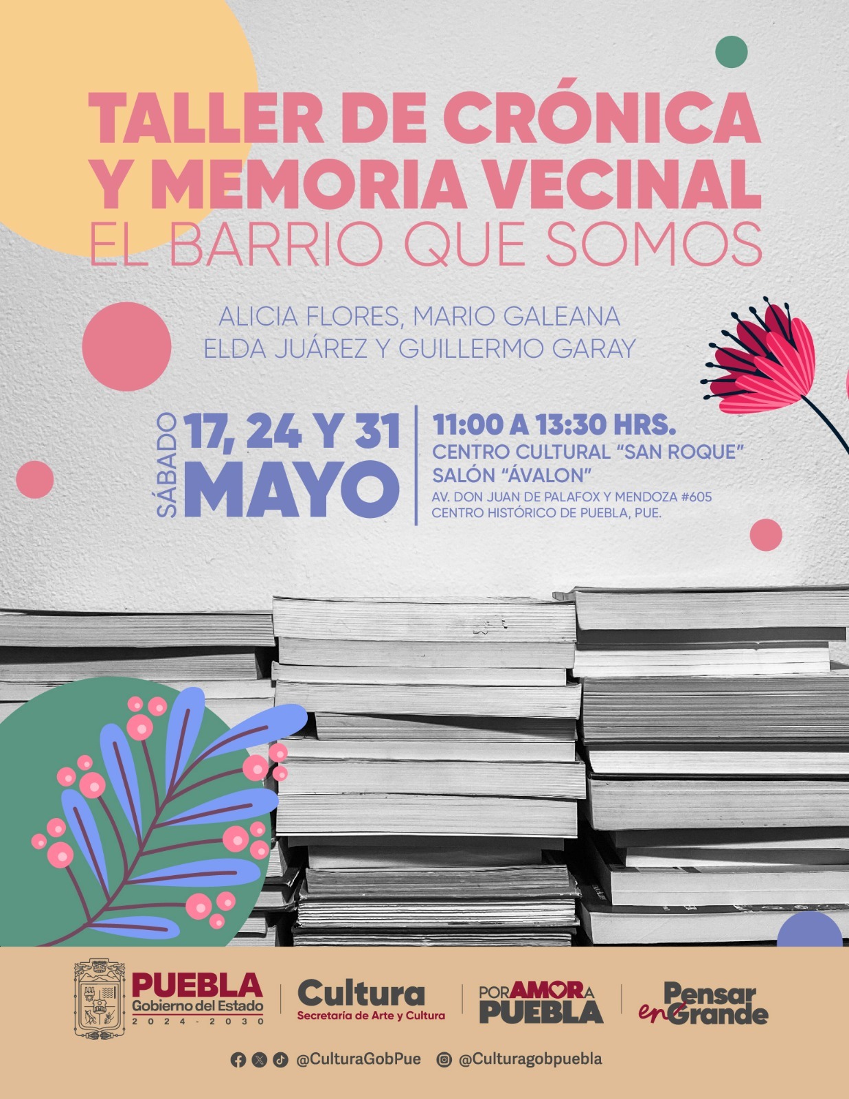 CIUDAD DE PUEBLA, Pue.- El gobierno estatal, a través de la Secretaría de Arte y Cultura, impartirá el taller de crónica literaria “El barrio que somos”, un espacio de aprendizaje para escribir y compartir historias sobre barrios, calles, mercados, casas y otros espacios que se han transformado o desaparecido a lo largo del tiempo, a fin de proporcionar una herramienta que ayude a preservar y difundir la memoria colectiva poblana.