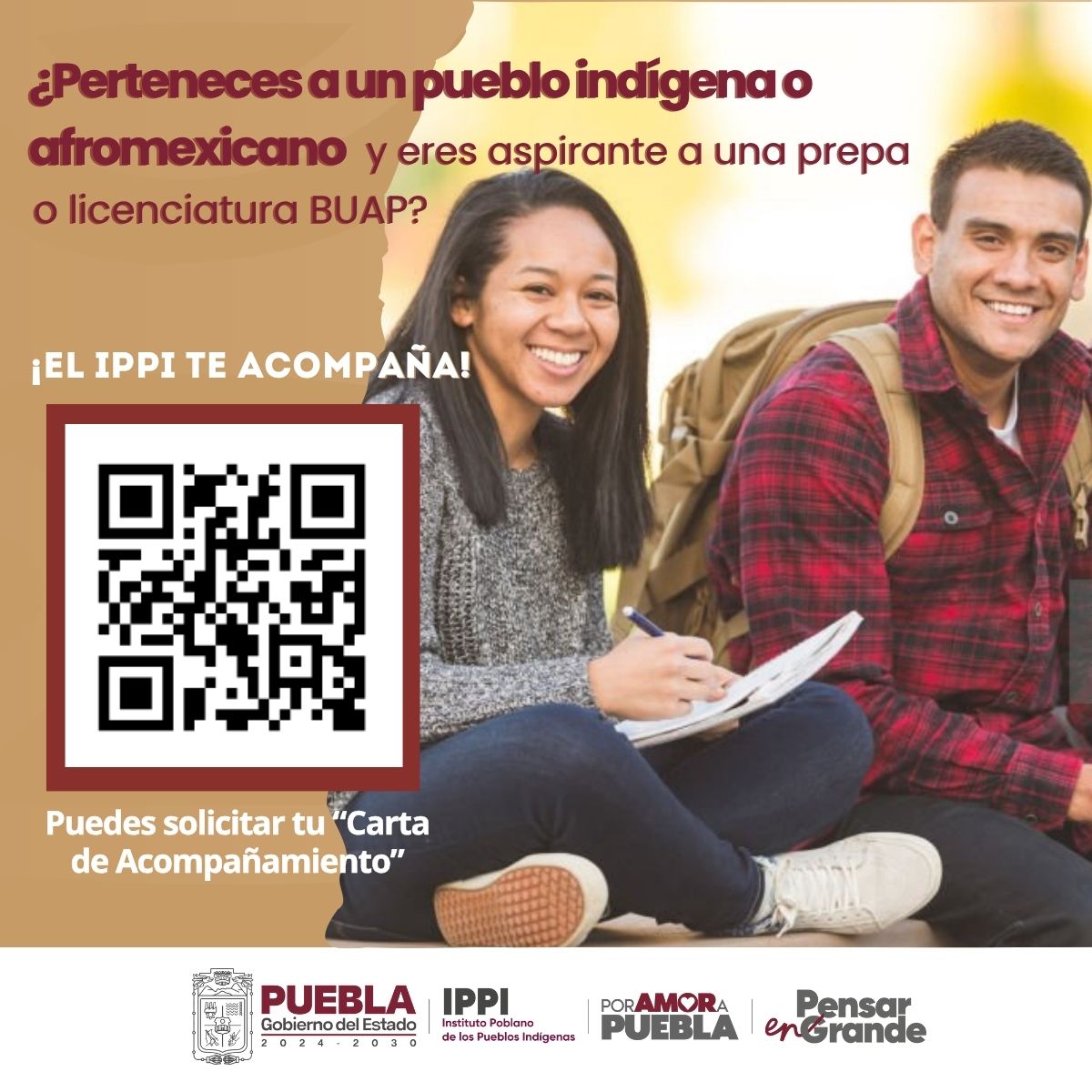 La Carta de Acompañamiento es un mecanismo institucional impulsado de manera conjunta por el Instituto Poblano de los Pueblos Indígenas (IPPI) y la Benemérita Universidad Autónoma de Puebla (BUAP). Este instrumento tiene como propósito brindar apoyo a las y los jóvenes aspirantes pertenecientes a comunidades indígenas y afromexicanas que desean continuar con su formación académica en los niveles de educación media superior y superior (licenciatura) dentro de la oferta educativa de la BUAP.