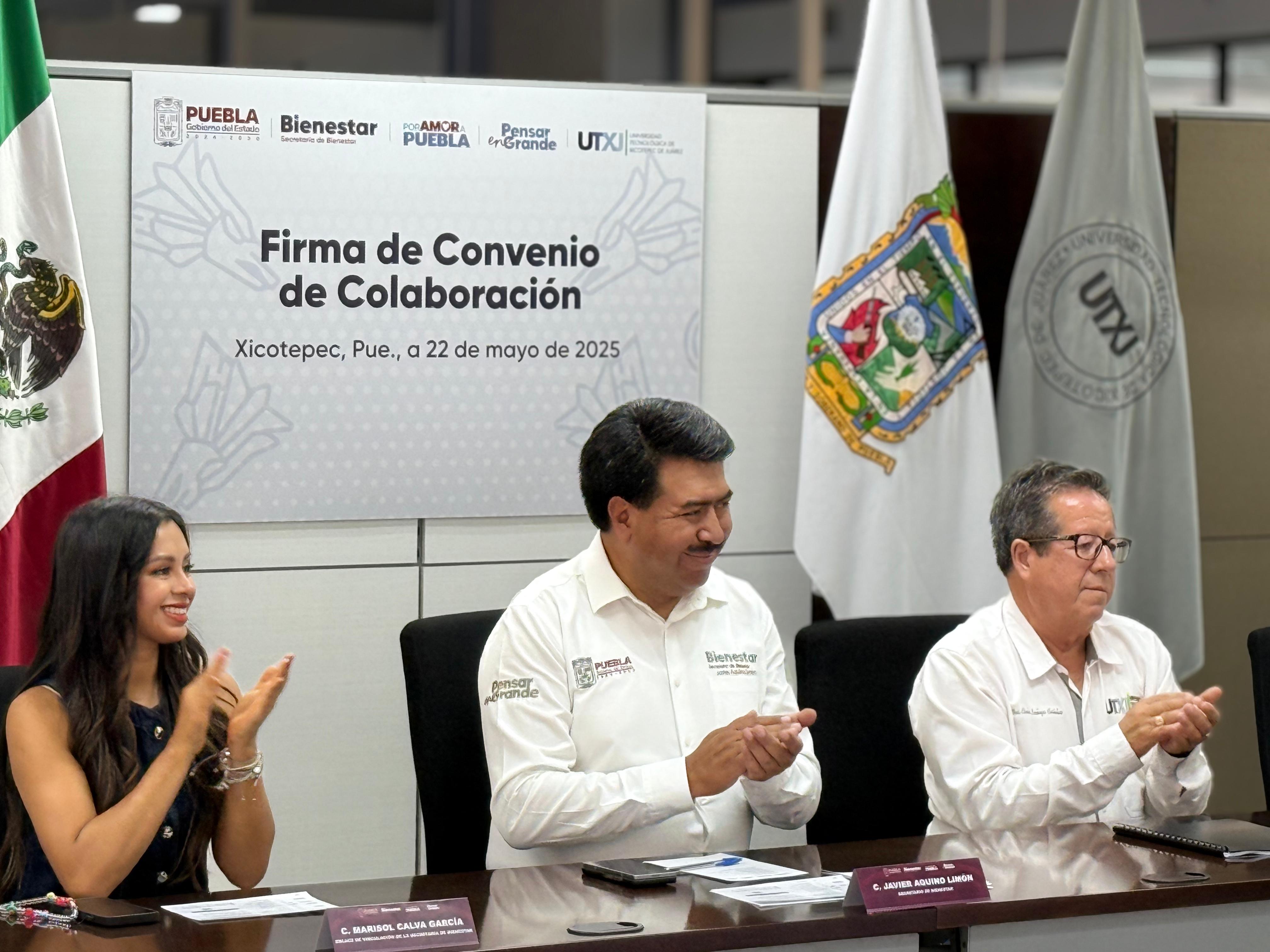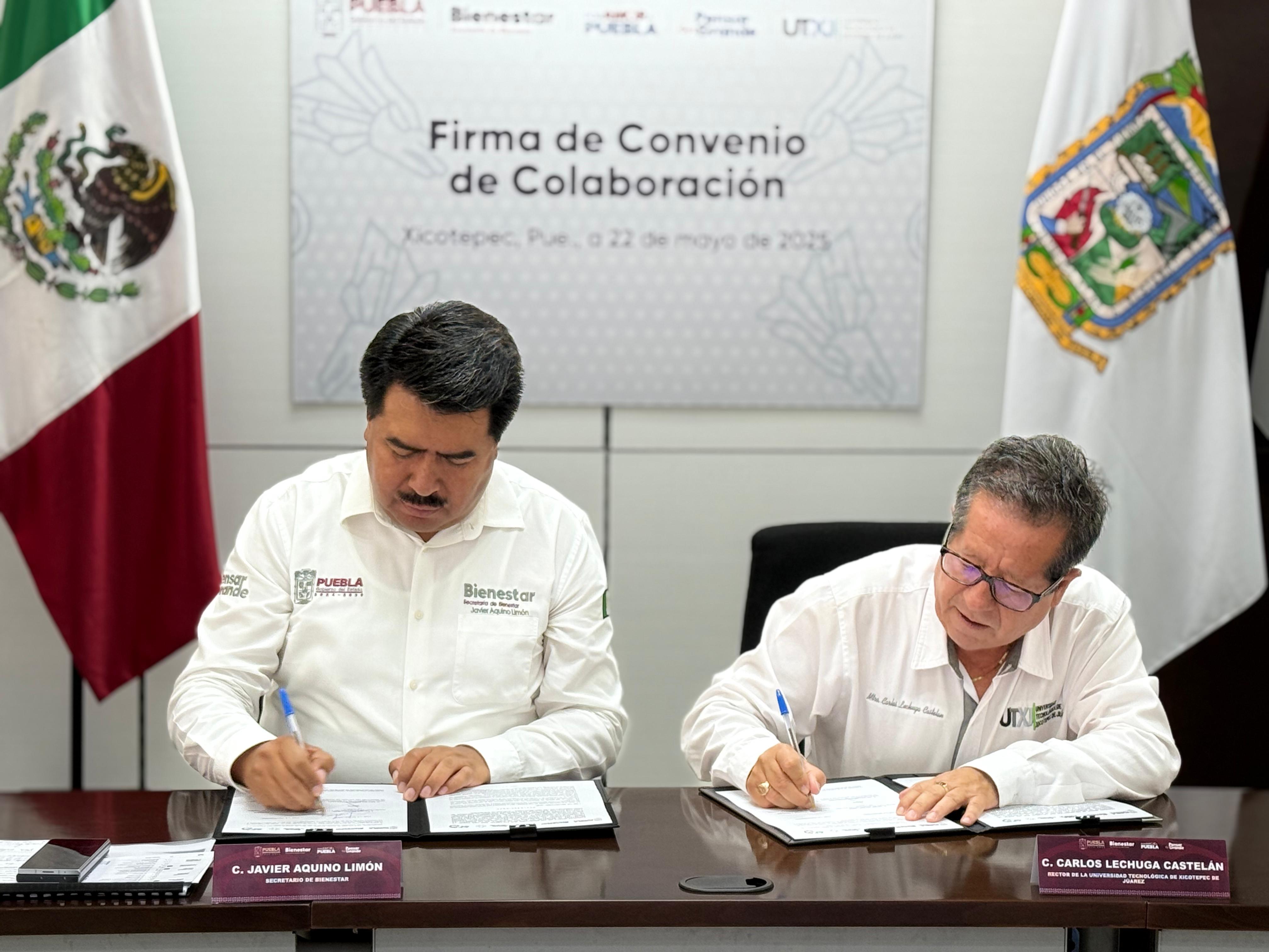 XICOTEPEC, Pue.- El secretario de Bienestar, Javier Aquino Limón, firmó un convenio de colaboración con el rector de la Universidad Tecnológica de Xicotepec de Juárez, Carlos Lechuga Castelán, para impulsar talentos y consolidar los programas de servicio social y prácticas profesionales, uno de los principios del gobierno humanista de Alejandro Armenta.