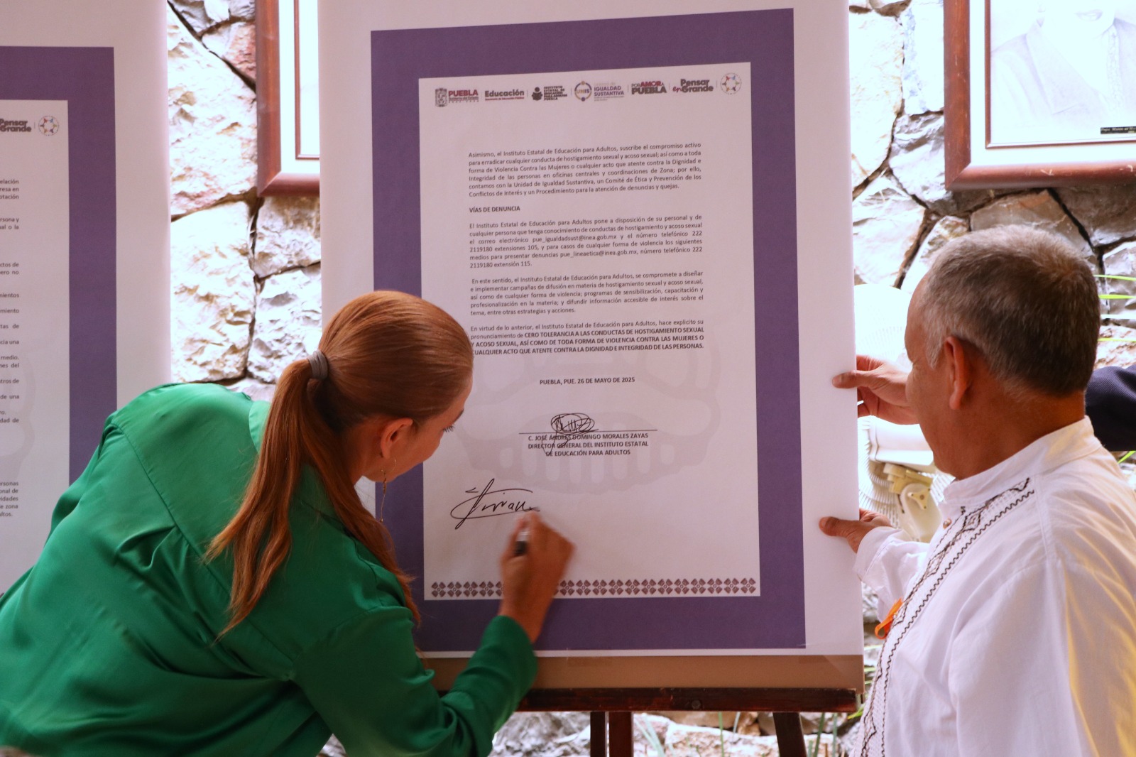 CIUDAD DE PUEBLA, Pue.- En el marco del #DíaNaranja y como parte de la política integral del Gobierno del Estado de Puebla para prevenir, sancionar y erradicar la violencia de género, la titular de la Secretaría de las Mujeres, Yadira Lira Navarro, participó en la firma del pronunciamiento “Cero tolerancia a las conductas de hostigamiento sexual y acoso sexual, así como a toda forma de violencia”, convocado por el Instituto Estatal de Educación para Adultos (IEEA).