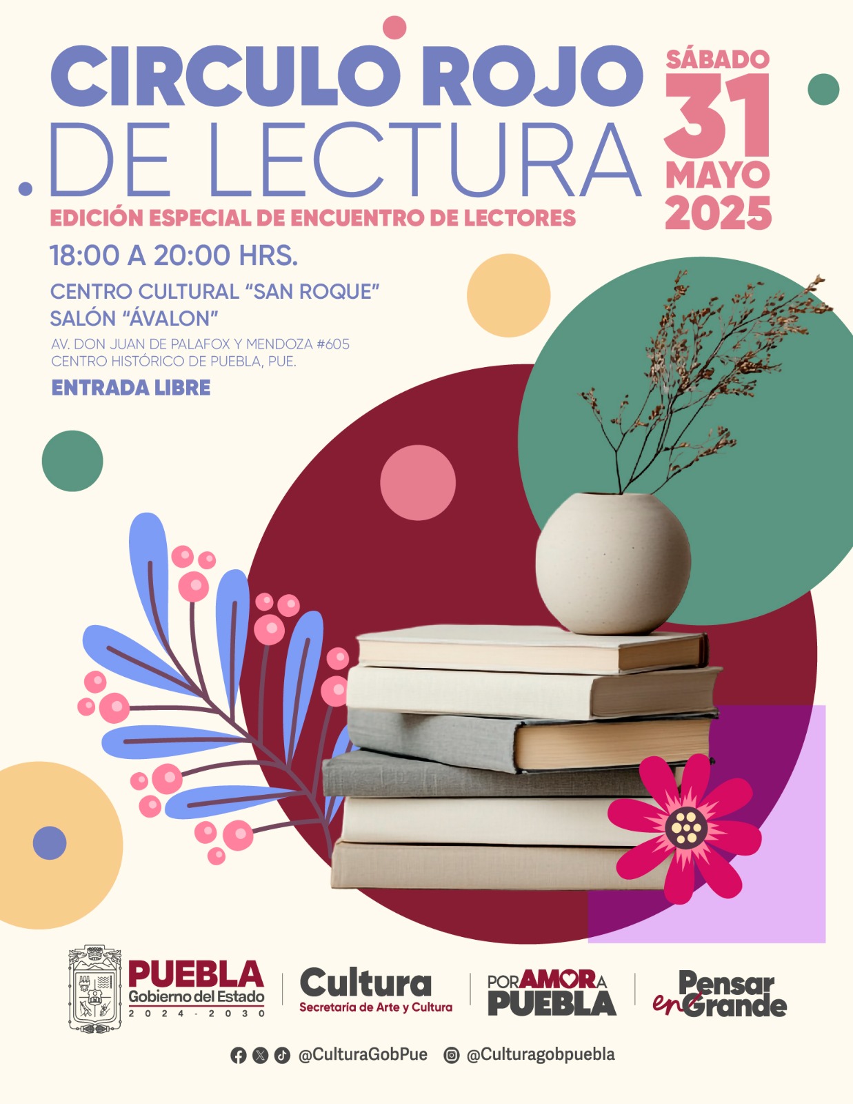 Todos los eventos de la Secretaría de Arte y Cultura se publican en la página web sc.puebla.gob.mx, así como en las redes sociales Facebook “Secretaría de Cultura Puebla”, X “@CulturaGobPue” e Instagram “@culturagobpuebla”.