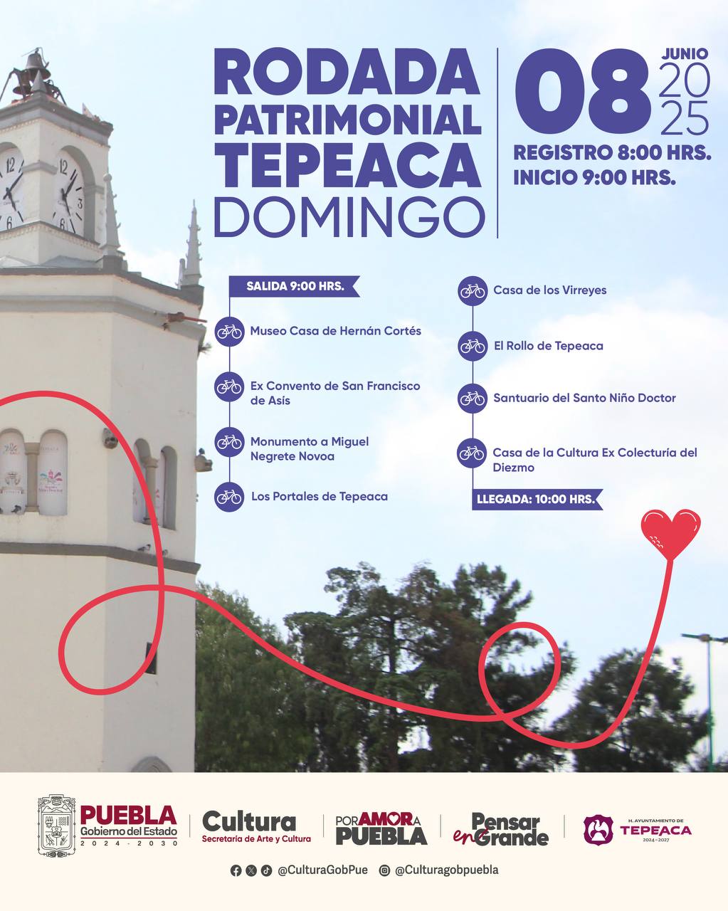 Toda la información acerca de esta y próximas fechas de las Rodadas Patrimoniales, puede consultarse en las redes sociales oficiales de la Secretaría de Arte y Cultura: Facebook: “Secretaría de Cultura Puebla”, Instagram “@culturagobpuebla” y X “@CulturaGobPue”.