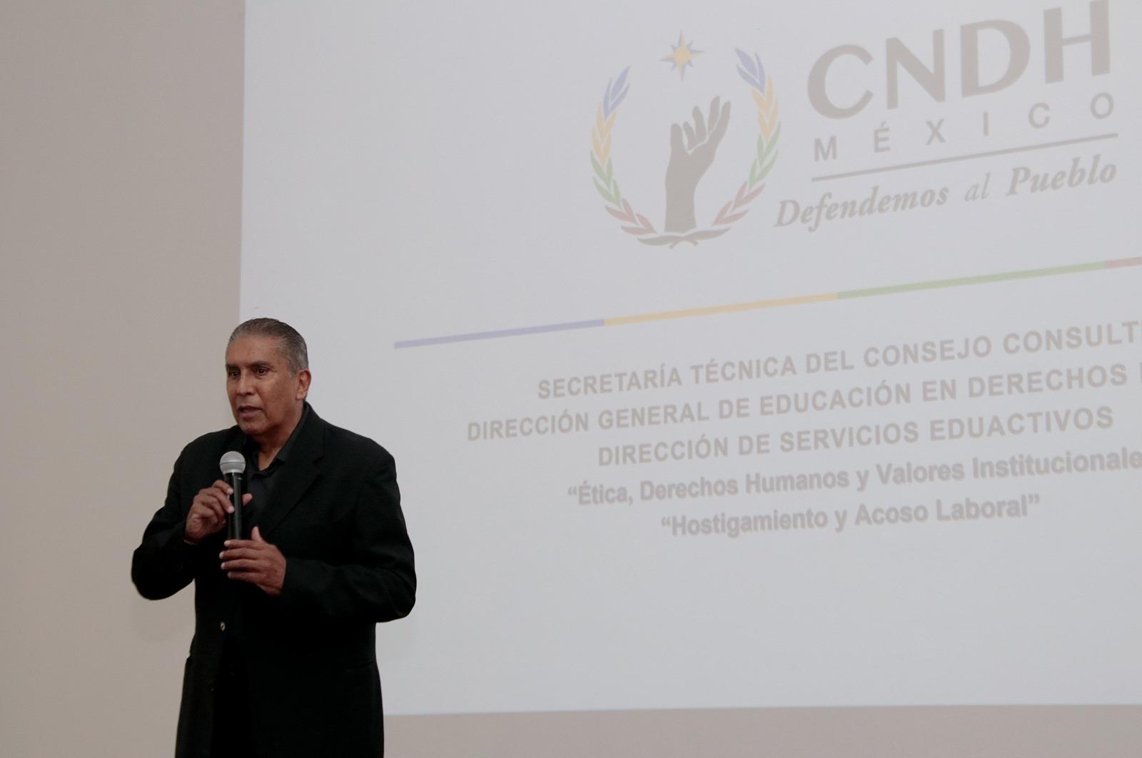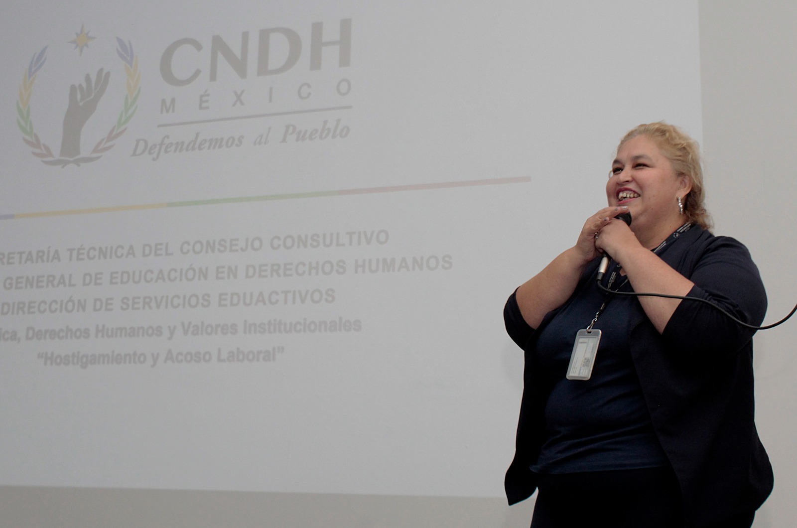 El ciclo de conferencias a todo el personal médico y administrativo fue impartido por la maestra capacitadora de la Comisión Nacional de Derechos Humanos (CNDH), Alma Rosa Saldaña Bernal, quien durante tres días habló de reflexiones fundamentales para la sociedad: la ética, los derechos humanos, los valores institucionales, como la prevención del hostigamiento, acoso laboral y/o sexual.
