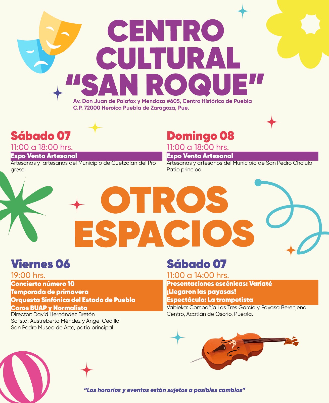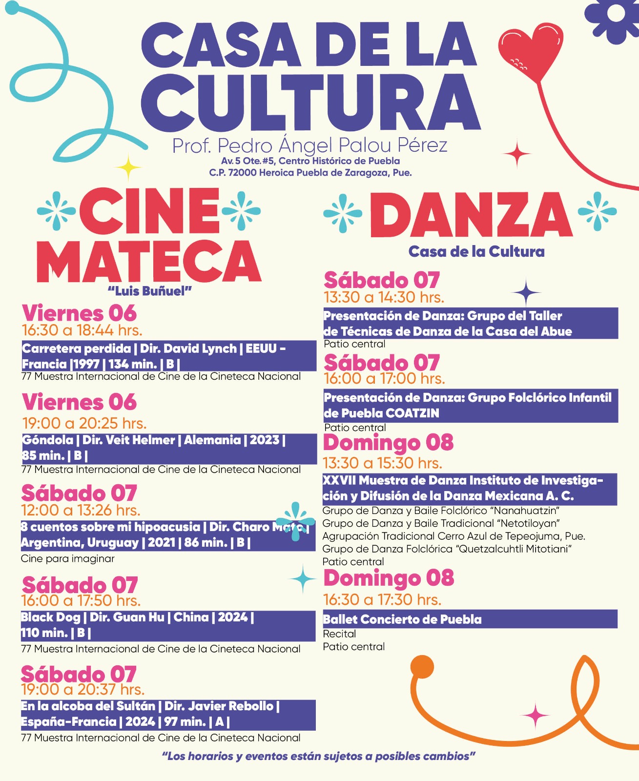 Los horarios de cada actividad pueden consultarse a través de la cartelera semanal publicada por la Secretaría de Arte y Cultura a través de las redes sociales: Facebook: “Secretaría de Cultura Puebla”, Instagram “@culturagobpuebla” y X “@CulturaGobPue”.