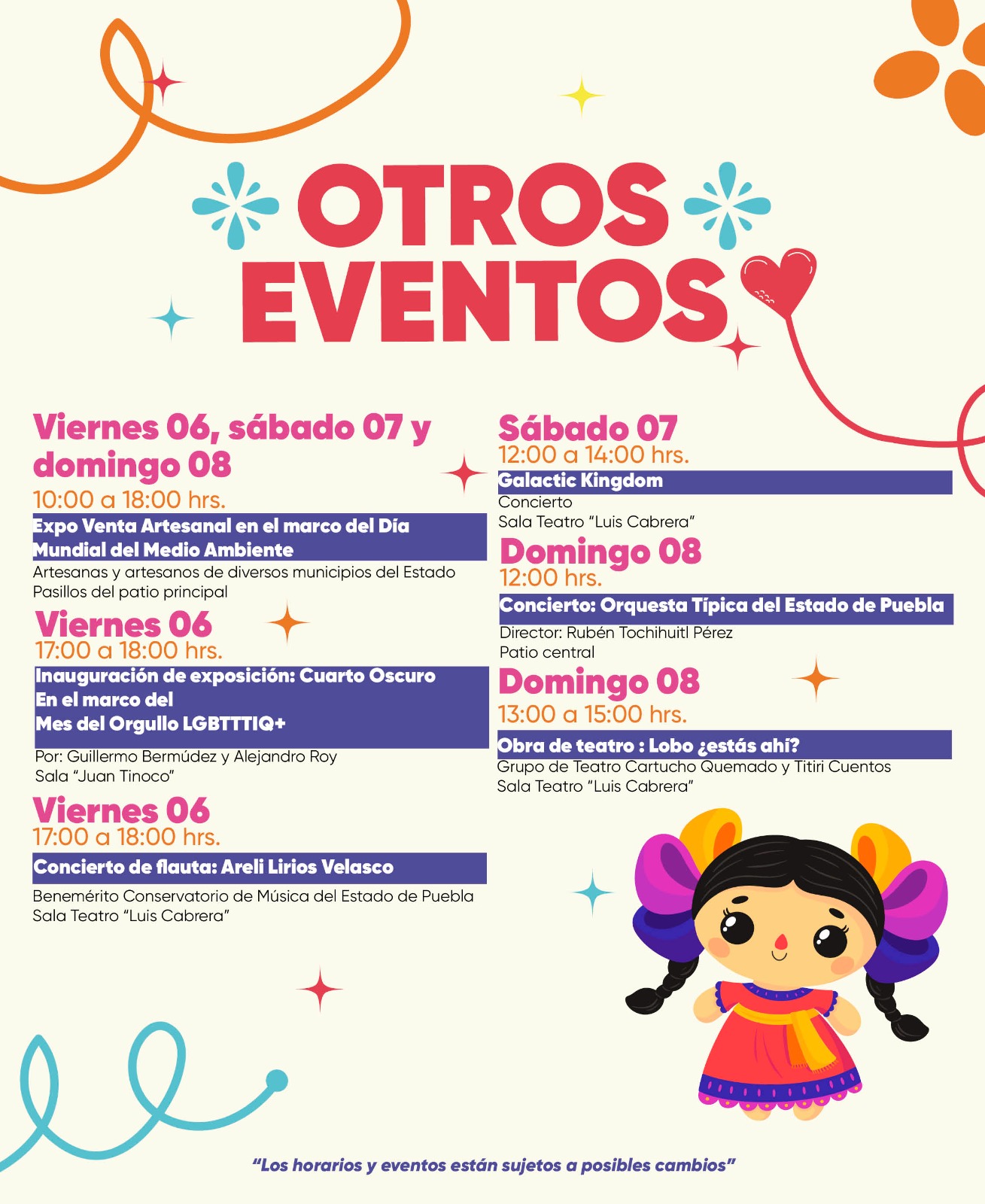 Igualmente, tendrán lugar proyecciones de la 77 Muestra Internacional de Cine de la Cineteca Nacional y de Cine para Imaginar; así como presentaciones del Grupo del Taller de Técnicas de Danza de la Casa del Abue, del Grupo Folclórico Infantil de Puebla “Coatzin” y del Ballet Concierto de Puebla. Asimismo, se presentará la obra de teatro "Lobo ¿estás ahí?" y los conciertos de la flautista Areli Lirios Velasco, Galactic Kingdom y la Orquesta Típica del Estado de Puebla.