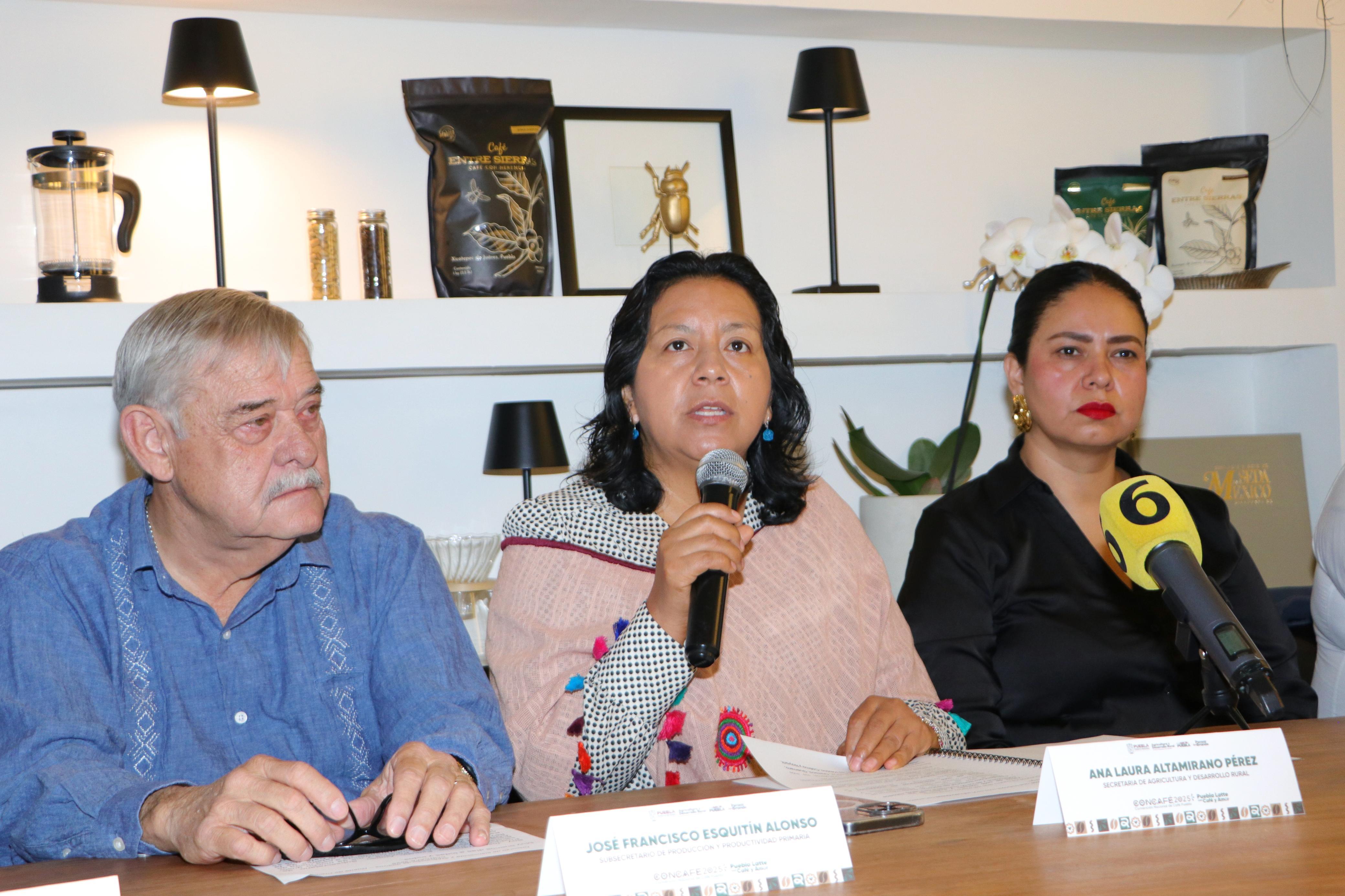 SAN ANDRÉS CHOLULA, Pue.- En rueda de prensa desde la cafetería Entre Sierras de productoras de la Sierra Norte, la secretaria de Agricultura y Desarrollo Rural del Gobierno del Estado, Ana Laura Altamirano Pérez, anunció la Convención Nacional de Café Puebla 2025, evento que por primera vez se realizará en territorio poblano, con la participación de 11 estados productores de café: Puebla, Chiapas, Oaxaca, Veracruz, Nayarit, Jalisco, Colima, San Luis Potosí, Hidalgo, Estado de México.