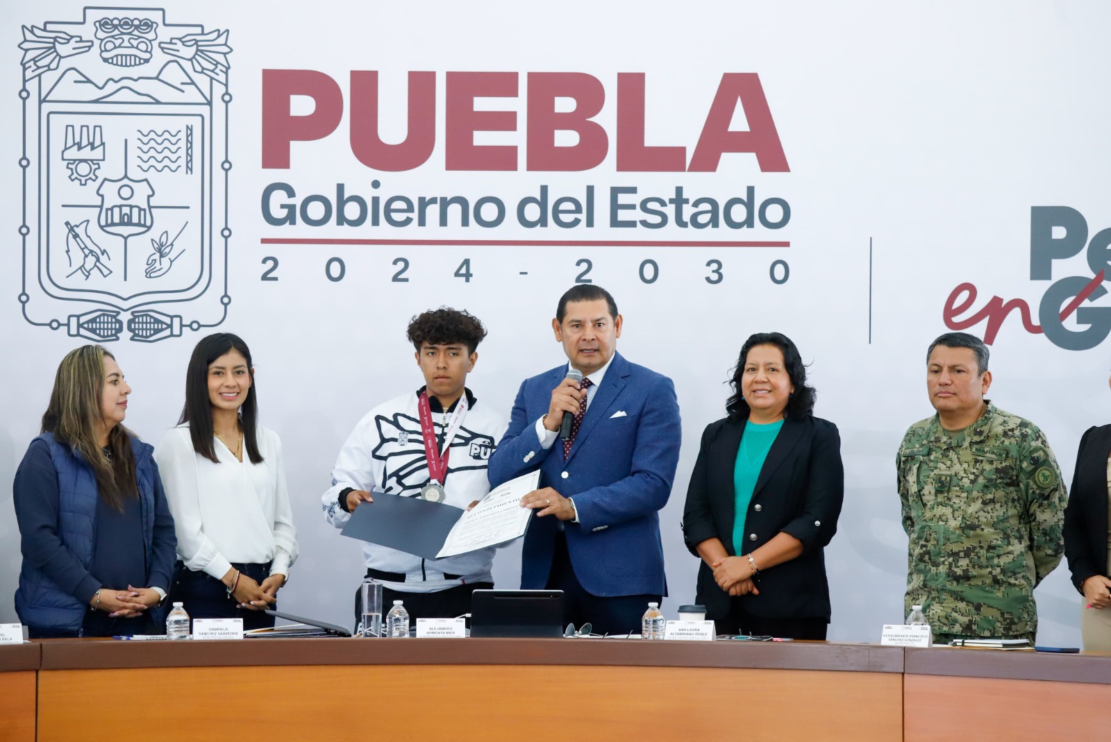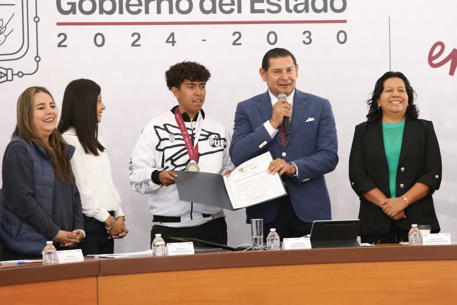 CIUDAD DE PUEBLA.- Durante la conferencia de prensa, el gobernador del estado de Puebla, Alejandro Armenta, reconoció el esfuerzo y los resultados del deportista Pedro Armenta Campos, exponente del Frontón poblano, quien obtuvo la medalla de plata en la modalidad de Paleta Goma Tres Paredes, categoría Juvenil B (16-17 años), en la Olimpiada Nacional CONADE 2025.