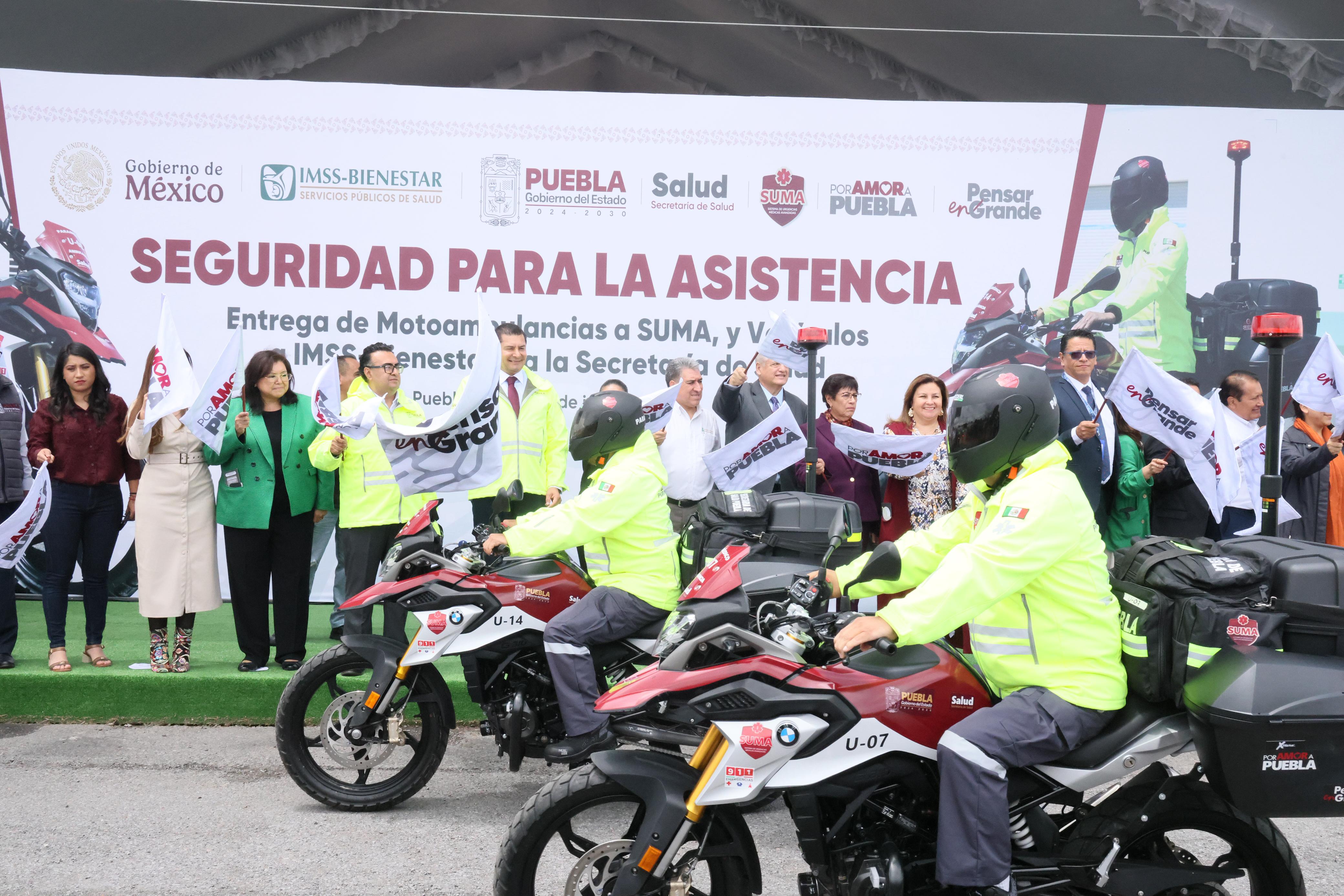 Durante el evento, el gobernador Alejandro Armenta encabezó la entrega de 10 motoambulancias y 220 equipos médicos al personal de SUMA, además de 27 vehículos para la Secretaría de Salud y 30 unidades más para IMSS-Bienestar, junto con 20 unidades móviles cargadas con insumos quirúrgicos y hospitalarios. El mandatario destacó que “la salud representa seguridad y la seguridad comienza por proteger la vida”. Anunció también la meta de homologar los salarios del personal médico con los niveles federales, cumpliendo la instrucción de la presidenta Claudia Sheinbaum, y afirmó que mantendrá la supervisión permanente hasta lograrlo.