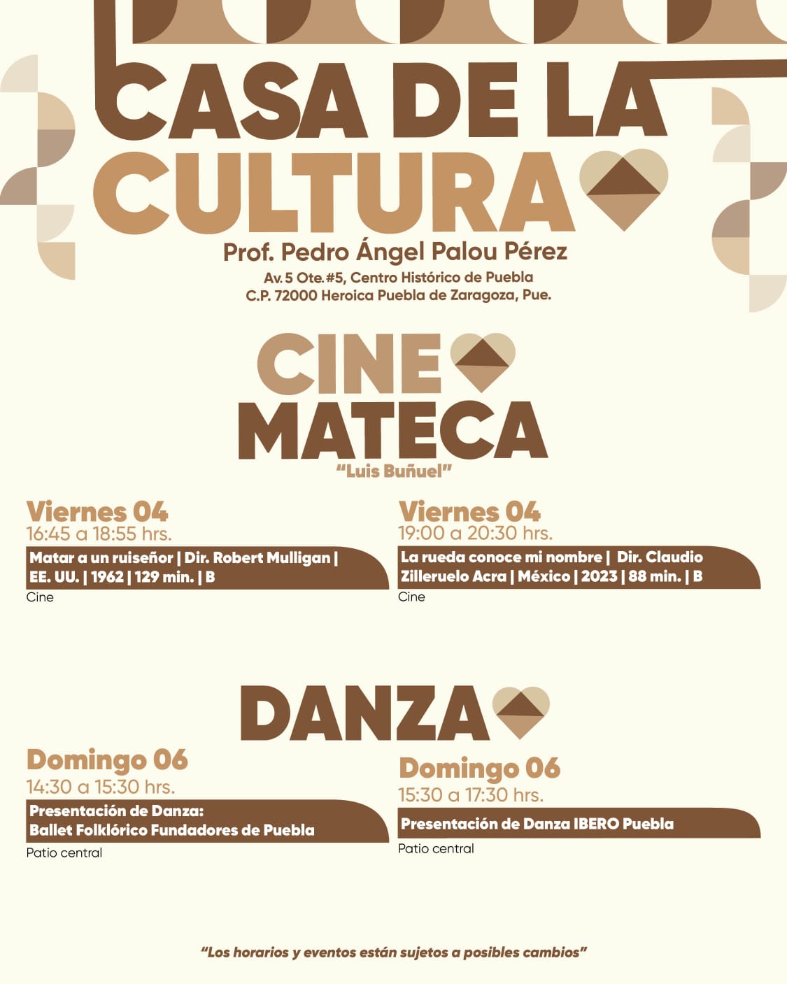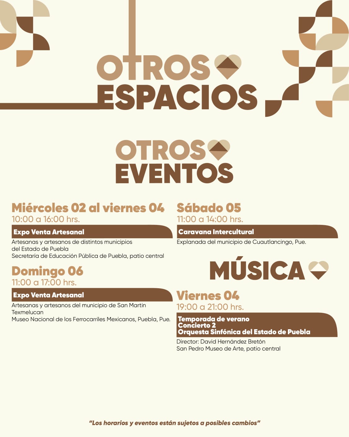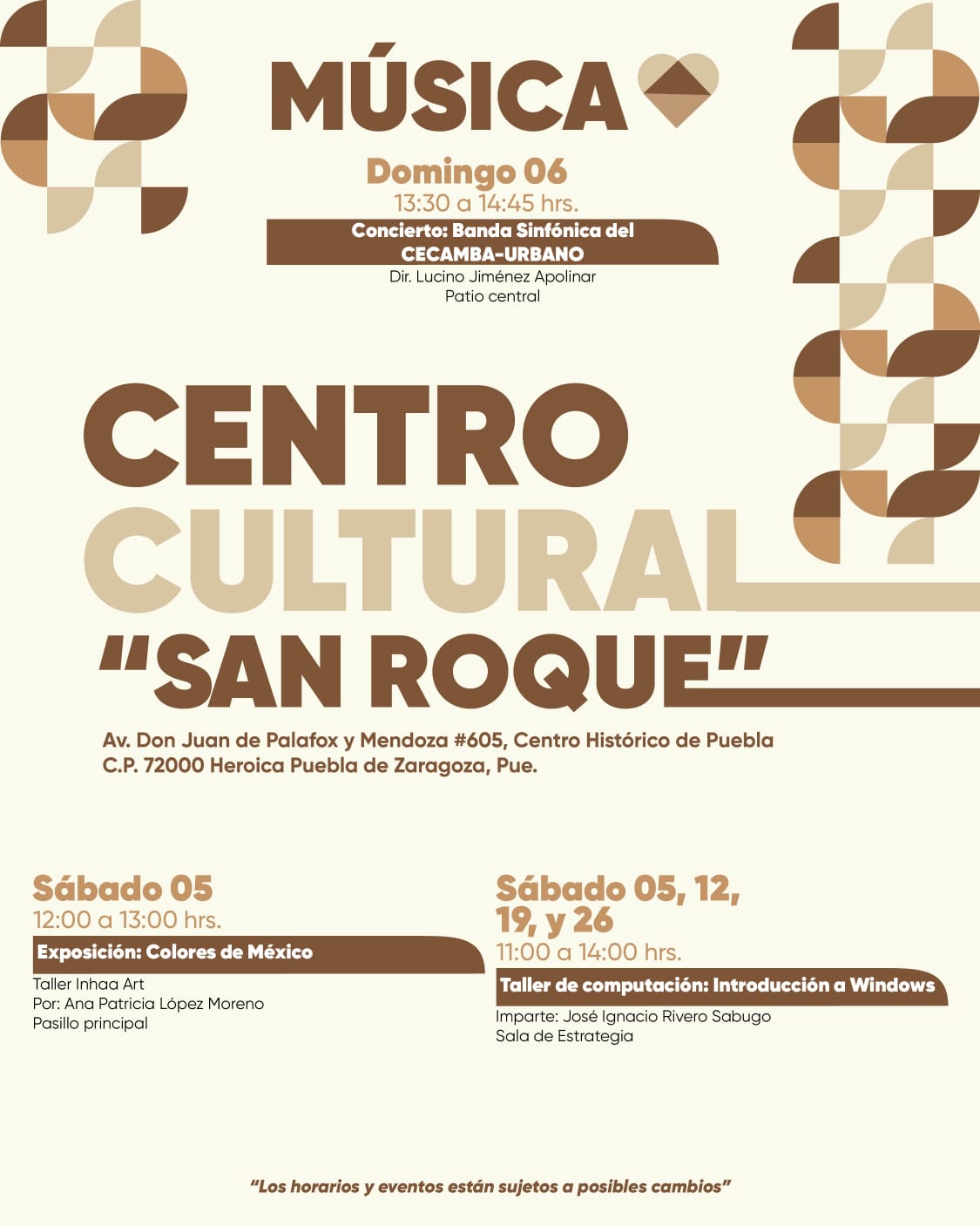 En tanto, la Casa de la Cultura “Profesor Pedro Ángel Palou Pérez” será sede de un concierto de la Banda Sinfónica del CECAMBA – URBANO, así como de presentaciones del Ballet Folklórico Fundadores de Puebla y grupos de danza de los talleres artísticos de la IBERO Puebla el domingo 06 a partir de las 13:30 horas.