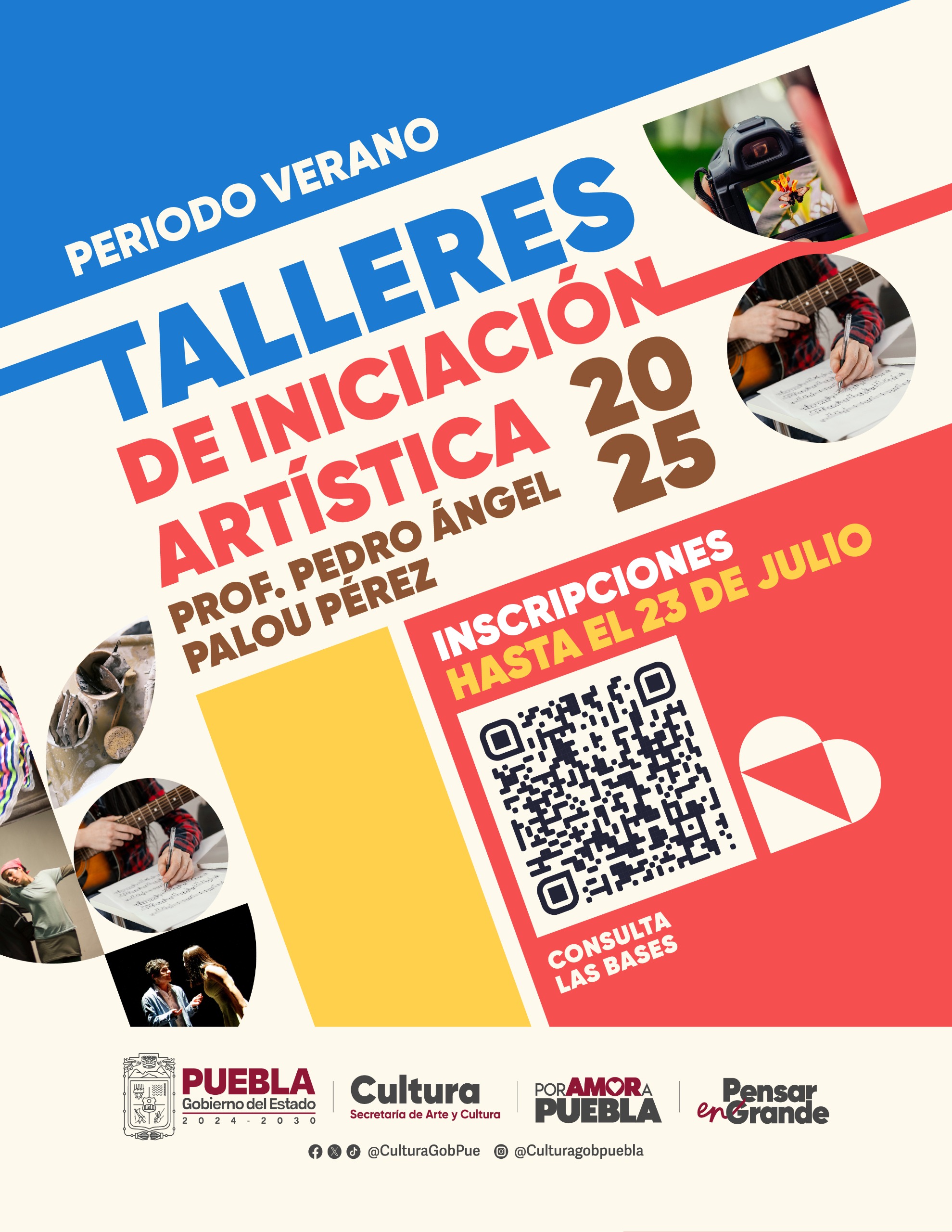 CIUDAD DE PUEBLA, Pue.- En pro del bienestar social y el desarrollo artístico de los habitantes de la entidad, el Gobierno del Estado de Puebla anunció la oferta de verano de los Talleres de Iniciación Artística “Pedro Ángel Palou Pérez”, cuyo periodo abarca del 14 de julio al 06 de septiembre e incluye más de 40 cursos presenciales y virtuales para todas las edades.