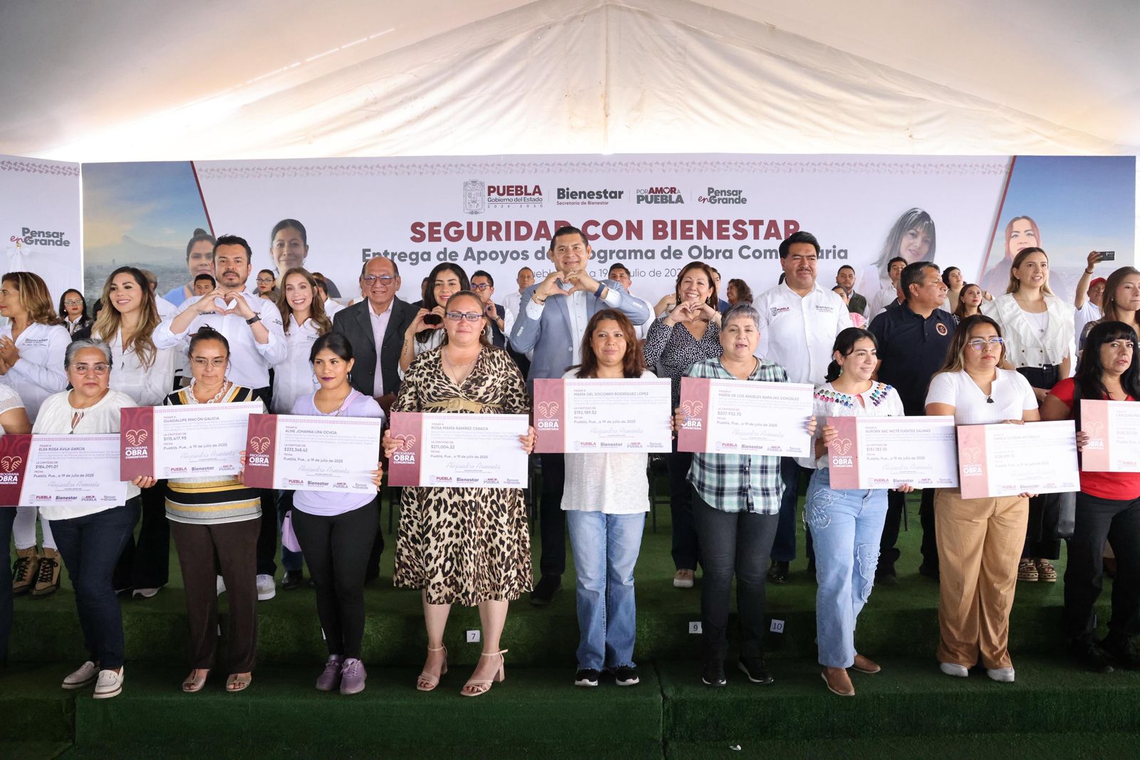 CIUDAD DE PUEBLA, Pue.- En medio de una intensa lluvia, el gobernador de Puebla, Alejandro Armenta, encabezó en la explanada de Plaza La Victoria, en la histórica zona de Los Fuertes, la entrega de más de 70 millones de pesos en 283 apoyos del programa “Obra Comunitaria”, iniciativa enfocada en seguridad con bienestar, justicia social y participación ciudadana.